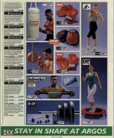 BRYAN BOXING GLOVES. lOoz leather boxing gloves. Heavy loam padding and preformed shape. Complete with laces. Men's size. Suitable for boxing. Cat. No. 301/6699 £12.50 6. BULLWORKERSUPERX5. For body buAding using isometric exerdses. BuUt-iil power meter for suength measurements.. Includes.fullcolour wall chan and !laining manual. Plus FREEBuUworXEf IOweI. Cat. No. 300/3640 £26.50 7