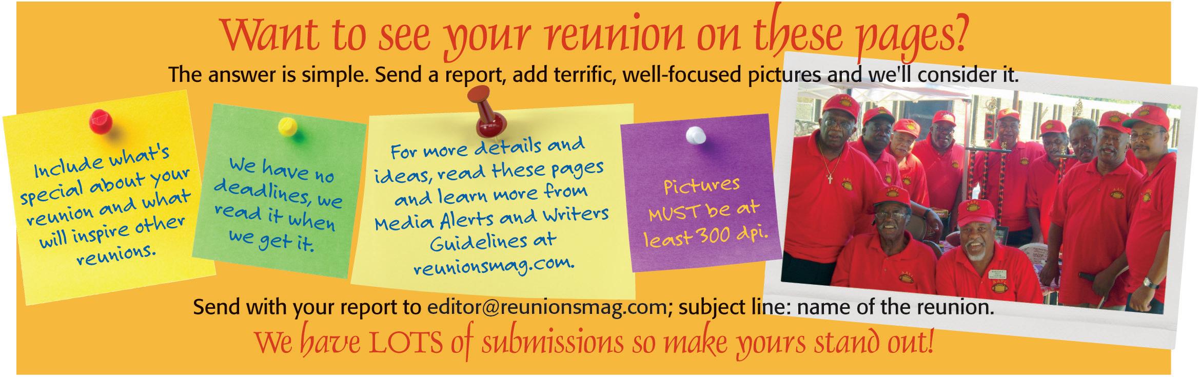 Reunion Planning Workshops are added regularly on the web at www.reunionsmag.com/getting-started/workshopsconferences-seminars/. Please check online for new offerings and changes.