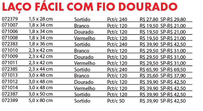Pronto - Prata e Ouro código Descrição Emb. Preço Preço SP 017912 Flor 16mm x 9cm pct. c/ 20 R$ 27,90 R$ 27,90 017913 Flor Grande 30mm x 13cm pct. c/ 20 R$ 32,90 R$ 32,90 código Descrição Emb. Preço Preço SP 003746 Mini-Flor 16mm x 6cm pct. c/ 20 R$ 17,90 R$ 17,90 003747 Flor 16mm x 9cm pct. c/ 20 R$ 27,90 R$ 27,90 003748 Flor Grande 30mm x 13cm pct. c/ 20 R$ 32,90 R$ 32,90