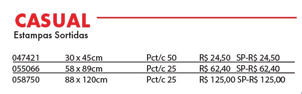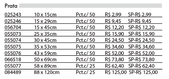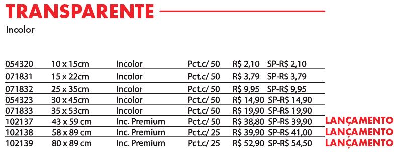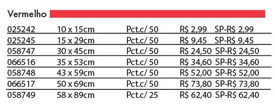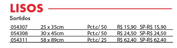 código Descrição Emb. Preço Preço SP 059583 Vermelho (15L x 21,5A x 8P cm) pct. c/ 10 R$ 14,90 R$ 14,90 059585 Rosa (15L x 21,5A x 8P cm) pct. c/ 10 R$ 14,90 R$ 14,90 059586 Azul Royal (15L x 21,5A x 8P cm) pct. c/ 10 R$ 14,90 R$ 14,90 código Descrição Emb. Preço Preço SP 059590 Sortidas (15L x 21,5A x 8P cm) pct. c/ 10 R$ 14,90 R$ 14,90 059591 Sortidas (18L x 25A x 10P cm) pct. c/ 10 R$ 16,50 R$ 16,50 059592 Sortidas (24L x 32A x 10P cm) pct. c/ 10 R$ 24,80 R$ 24,80 código Descrição Emb. Preço Preço SP 059579 Lisa Branca (18L x 25A x 10P cm) pct. c/ 25 R$ 36,90 R$ 36,90 059580 Lisa Branca (24L x 32A x 10P cm) pct. c/ 25 R$ 39,90 R$ 39,90 059581 Lisa Kraft (18L x 25A x 10P cm) pct. c/ 25 R$ 33,50 R$ 33,50 059582 Lisa Kraft (24L x 32A x 10P cm) pct. c/ 25 R$ 36,50 R$ 36,50 A L P