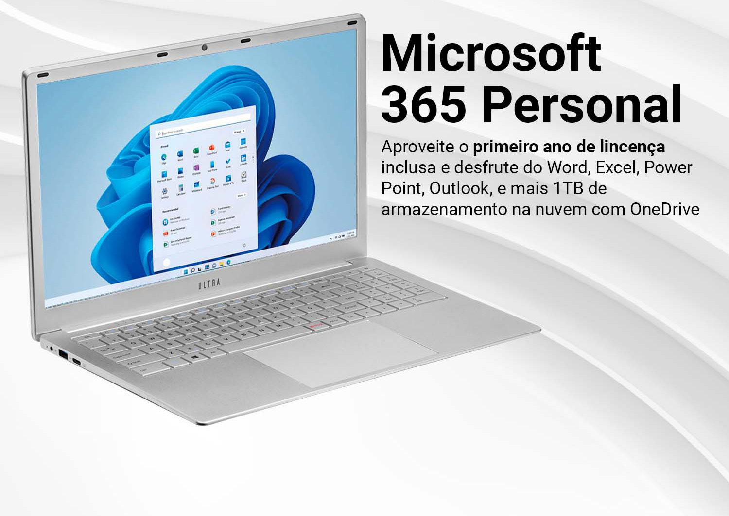 O desempenho notável do Notebook Ultra é possível graças ao novo processador Intel Celeron, e o Windows 11 Home. Perfeito para tarefas do dia a dia e navegação na internet. Agora também conta com um 1 ano de assinatura de Microsoft 365 Personal que contém as ferramentas do Office + 1 TB na nuvem*.