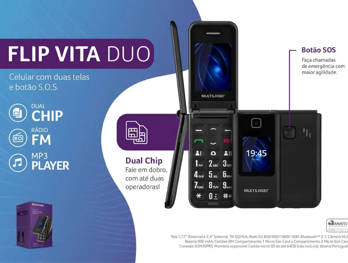 O Celular Flip Vita da Multilaser foi especialmente desenvolvido para atender seu papai, sua mamãe, vovô e vovó. Ele é super simples e fácil de ser utilizado. Sua tela de 2,4 polegadas com seu poderoso e largo teclado numérico facilita a visualização e digitação, sendo possível ainda ouvir os números discados ao digitar, sem risco de ligações efetuadas por engano e gastos desnecessário de crédito. Possui também Rádio FM, MP3 e câmera VGA, além de conexão bluetooth e entrada para cartão MicroSD de até 32 GB.É equipado com lanterna e botão de emergência, para não deixar na mão aquela pessoa tão especial na sua vida.