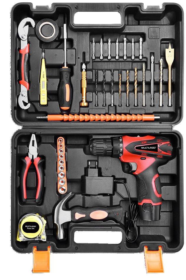 Parafusadeira com mandril de 3/8. (10mm), 18 níveis de torques + 1 nível de furação, seletor de sentido de giro, 2 velocidades, pega ergonômica, botão de acionamento, carregador bivolt automático, bateria lithium, com trava, 1x . Chave universal 8. 1x . Teste de teste digital de voltagem 12v / 220v 1x . Chave canhão para bits 1x . Chave de precisão 6 em 1 1x . Fita isolante 6x . Bits com ponteiras ( + / - / *) 1x . Adaptador soquete canhão 8x . Brocas 1x - bit 110mm com ponta dupla 1x - broca chata 20 1x - eixo flexível chicote de 30cm parafusadeira 9x . soquete canhão 1x . Trena de 3m 1x - martelo 1x - alicate 1xmaleta para acessórios.