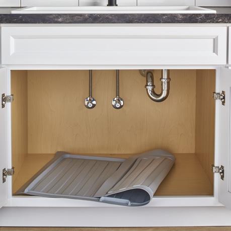 Flexible, durable, and easy-to-clean TPE construction, gray Funnels excess water out of the front of your cabinet