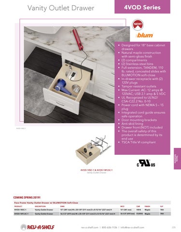 • Designed for 18” base cabinet drawers • Natural maple construction with semi-gloss finish • (2) compartments • (2) Stainless-steel bins • Full-extension, TANDEM, 110 lb. rated, concealed slides with BLUMOTION soft-close • In-drawer receptacle with (2) 120V plugs • Tamper resistant outlets • Max Current: AC: 12 amps @ 120VAC; USB 2.1 amp & 5 VDC • UL Recognized to UL962/ CSA-C22.2 No. 0-10 • Power cord with NEMA 5 – 15 plug • Integrated cord guide ensures safe operation • Door mounting brackets • Anti-skid lining • Drawer front (NOT) included • The overall safety of this product is determined by its end useSee Closet Section page • TSCA Title VImore compliant 276 for hampers