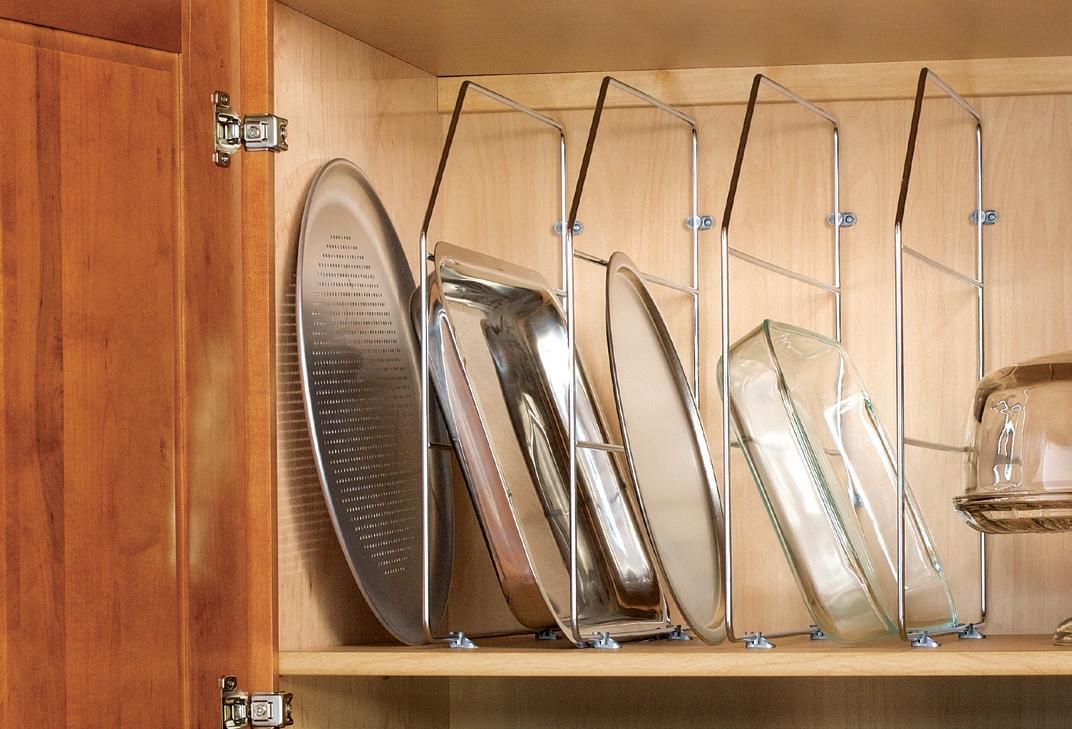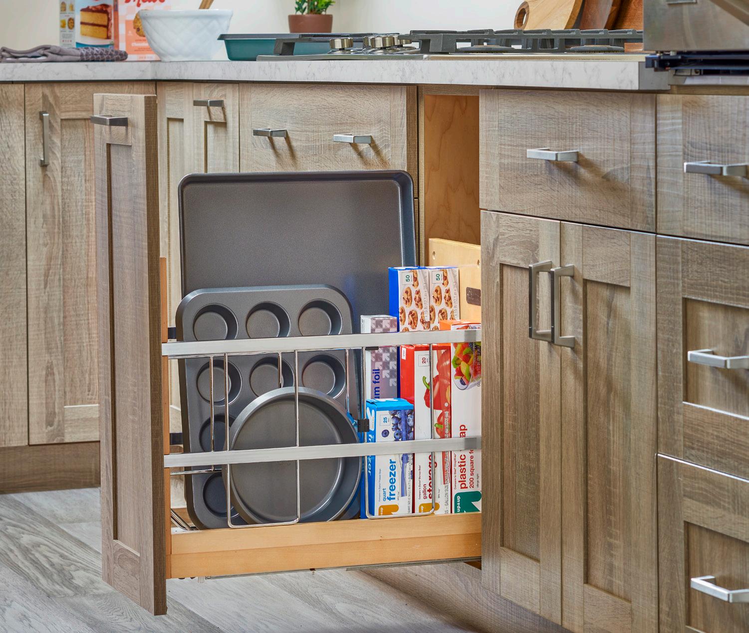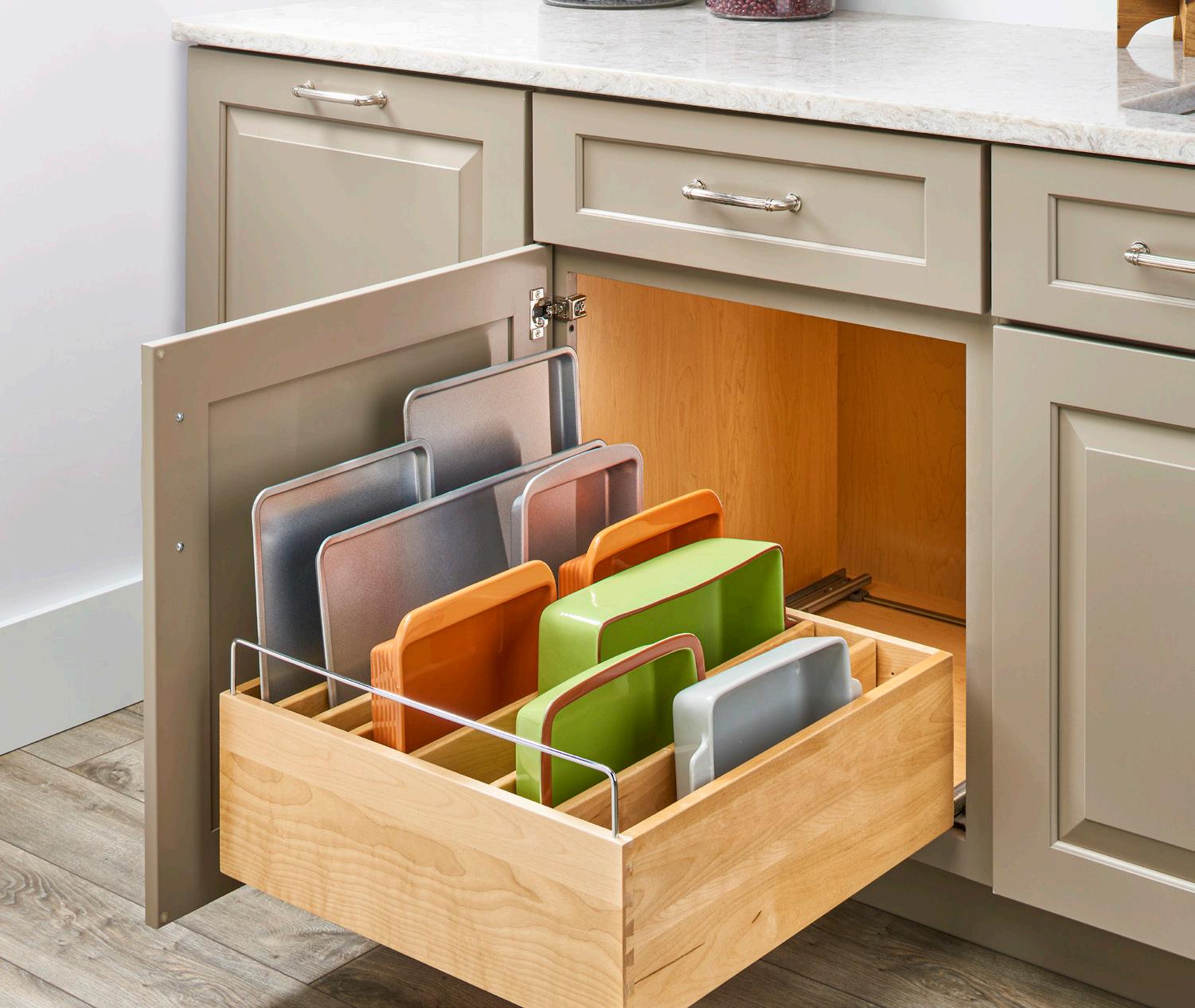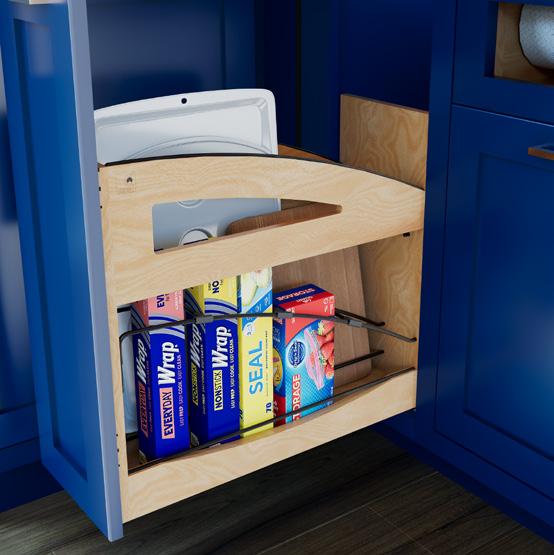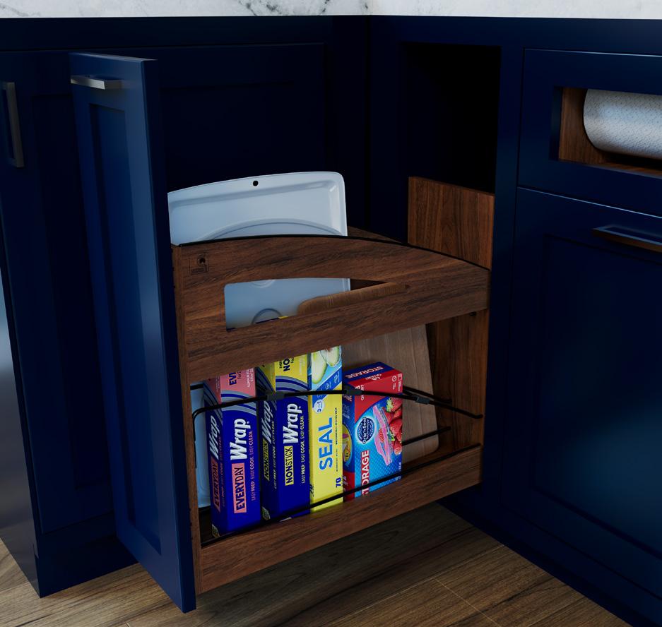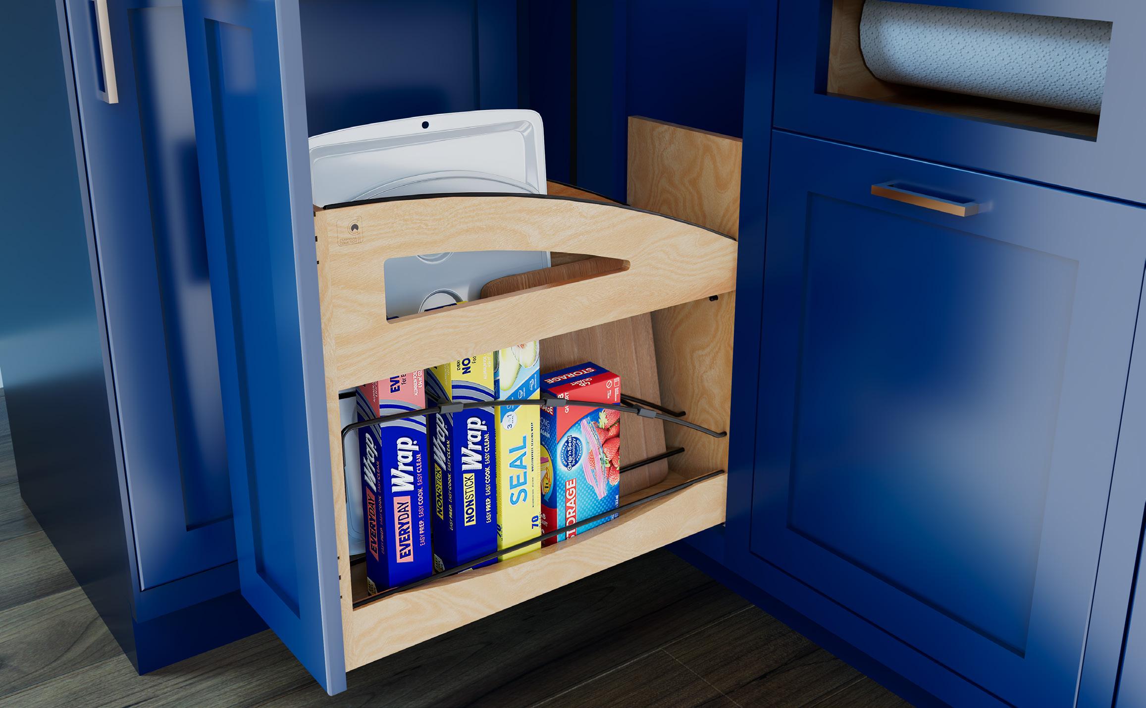 Every kitchen has a few items that can be a pain to keep organized; bakeware, cutting boards, trays and those long boxes of foil and plastic wrap are always near the top of that list! Rev-A-Shelf® is happy to solve another organization dilemma with the 447CC Craftsman Collection Base Cabinet Pullout with a Tray Divider and Foil Wrap Holder.
