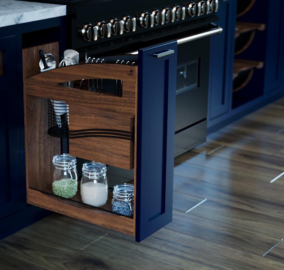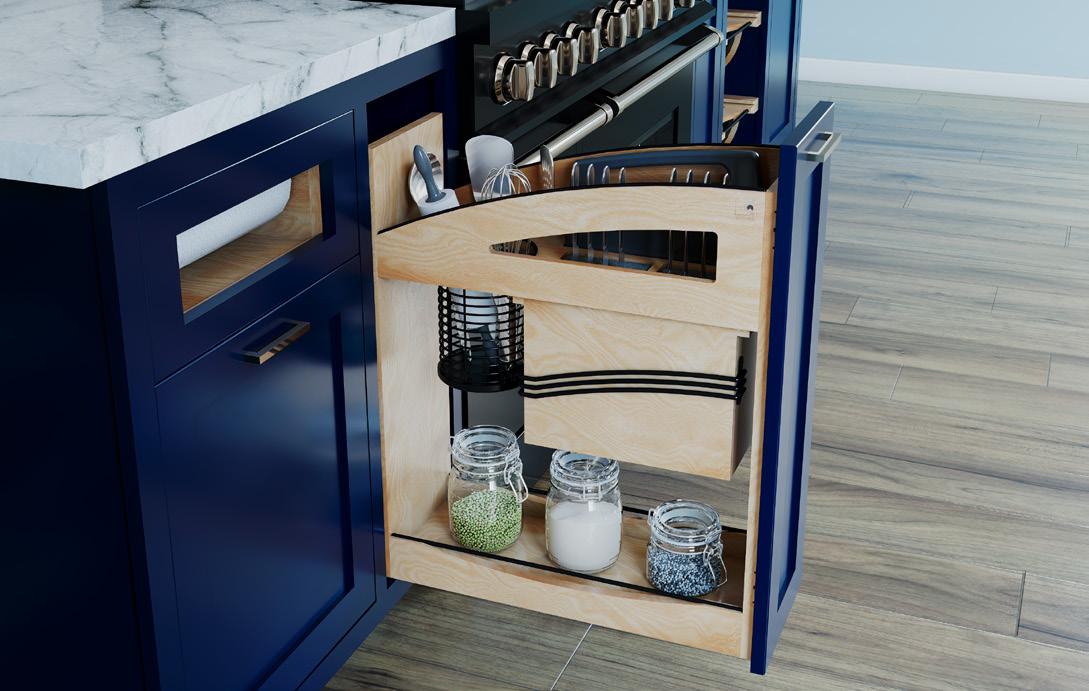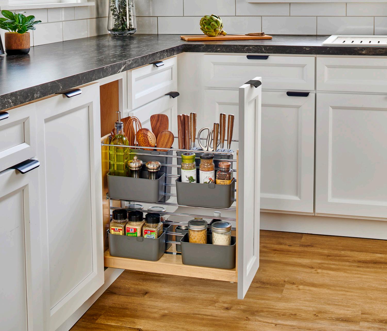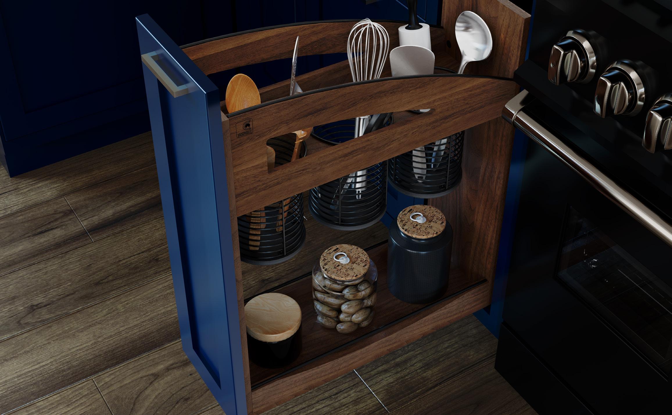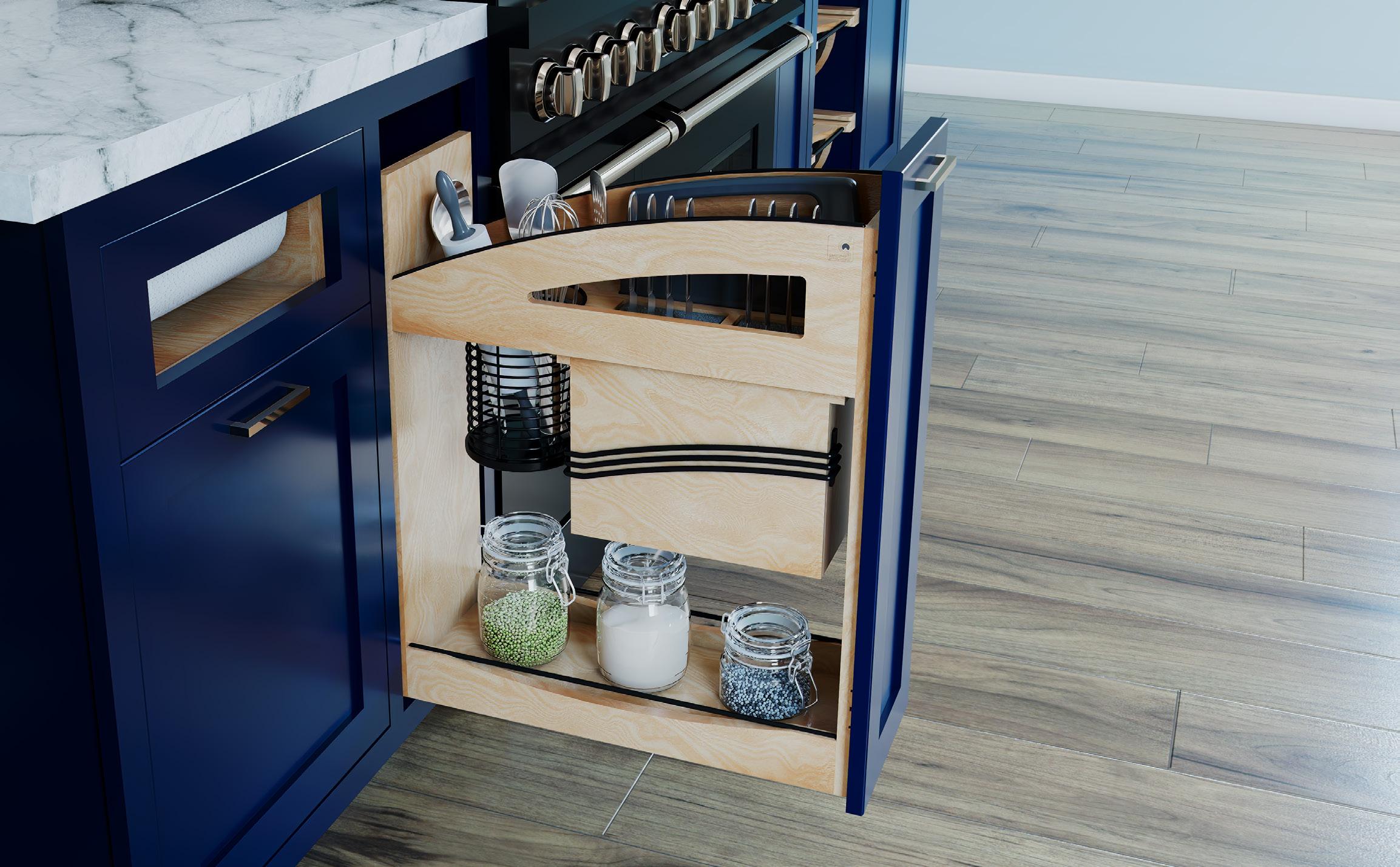 Complete with BLUM MOVENTO soft-close slides and patented door-mount brackets (US Patent No. 8,388,076), this innovative pullout organizer brings timeless craftsmanship with a modern touch and easy organization to your kitchen.