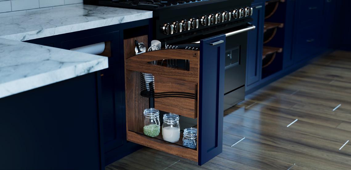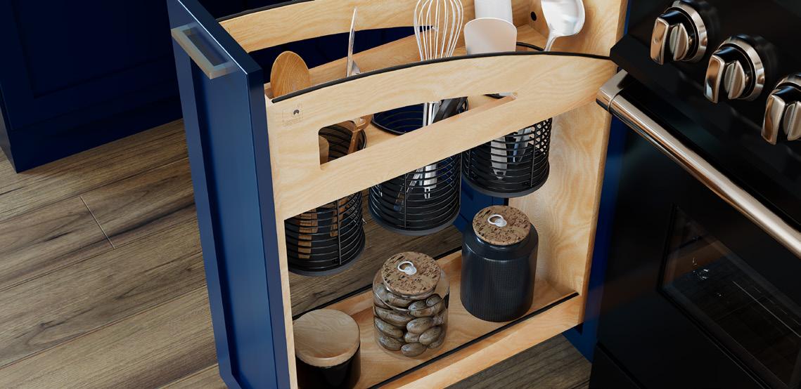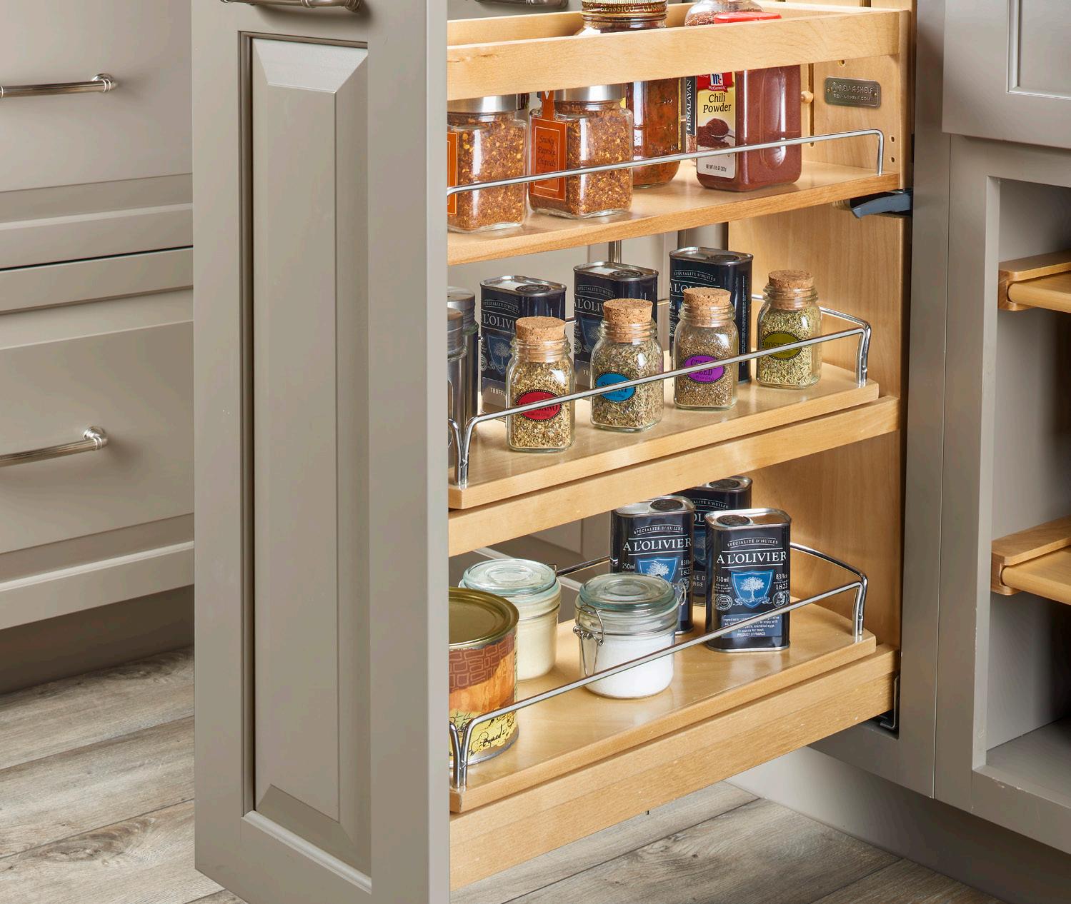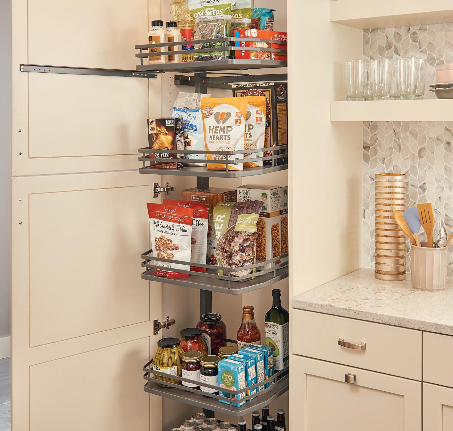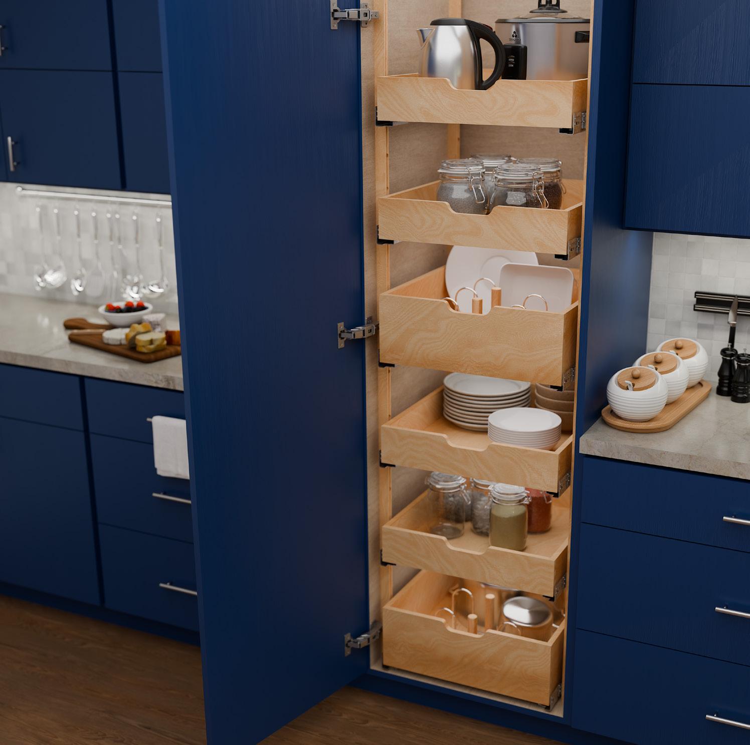 Complete with BLUM MOVENTO soft-close slides and patented door-mount brackets (US Patent No. 8,388,076), this innovative pullout organizer brings timeless craftsmanship with a modern touch and easy organization to your kitchen.