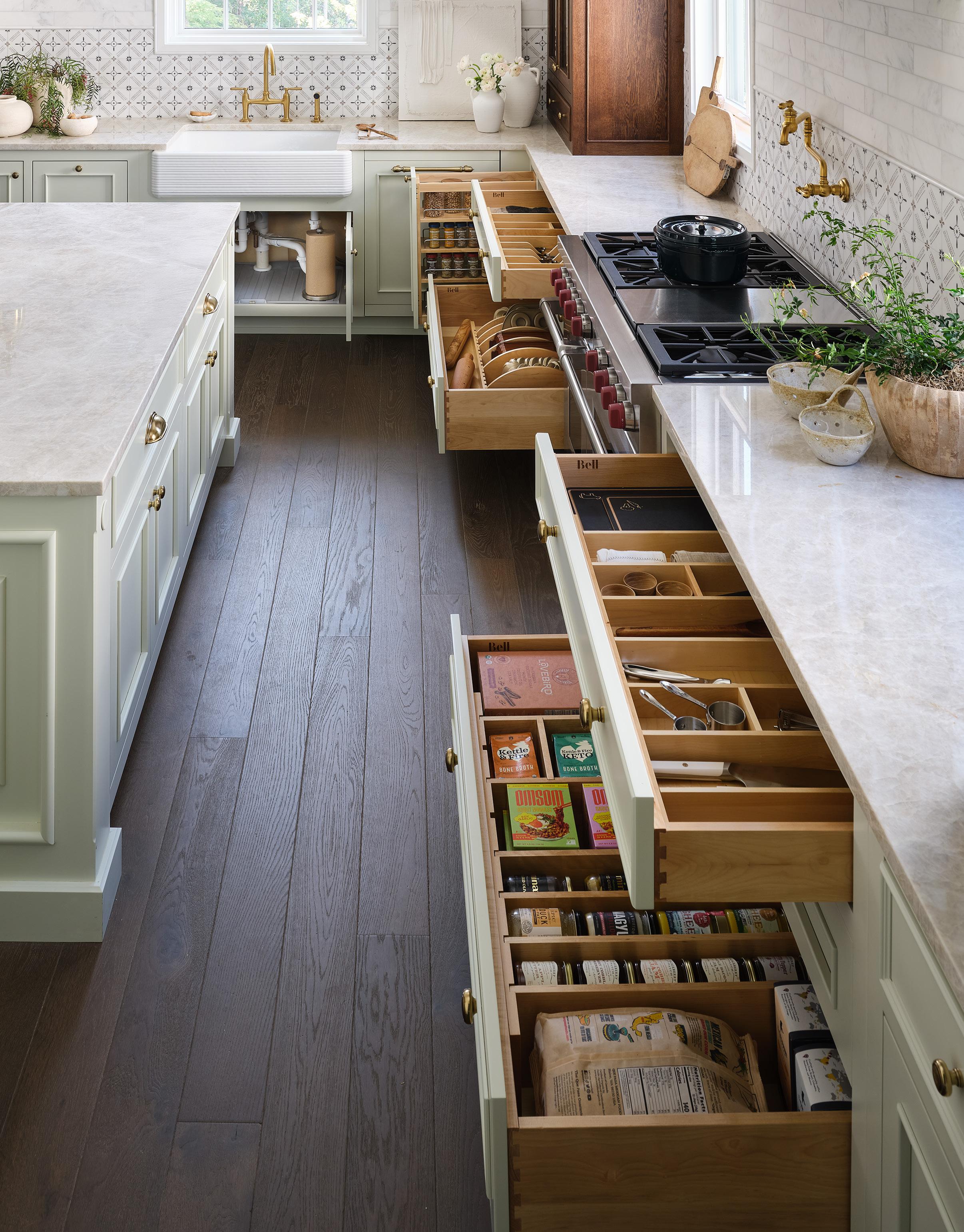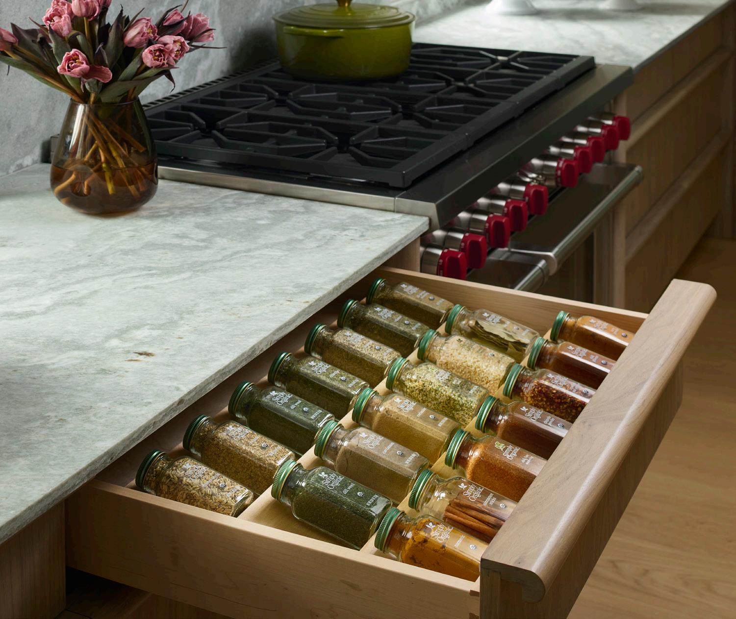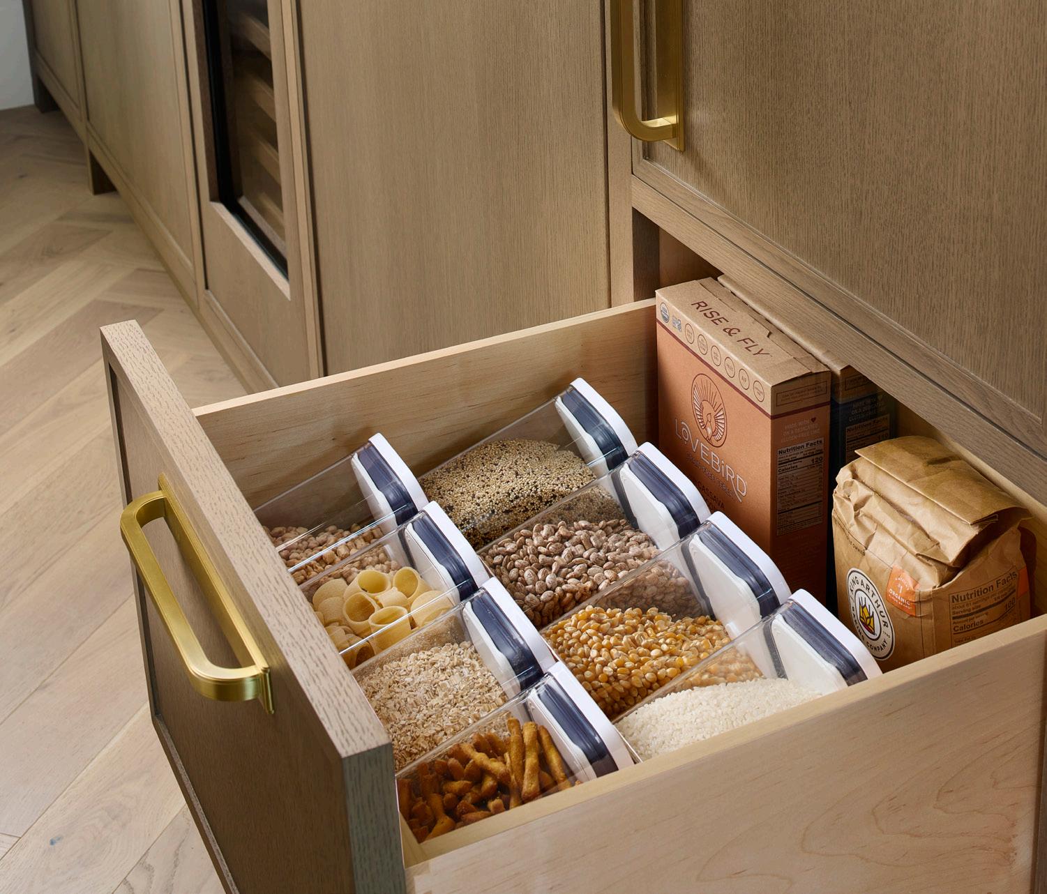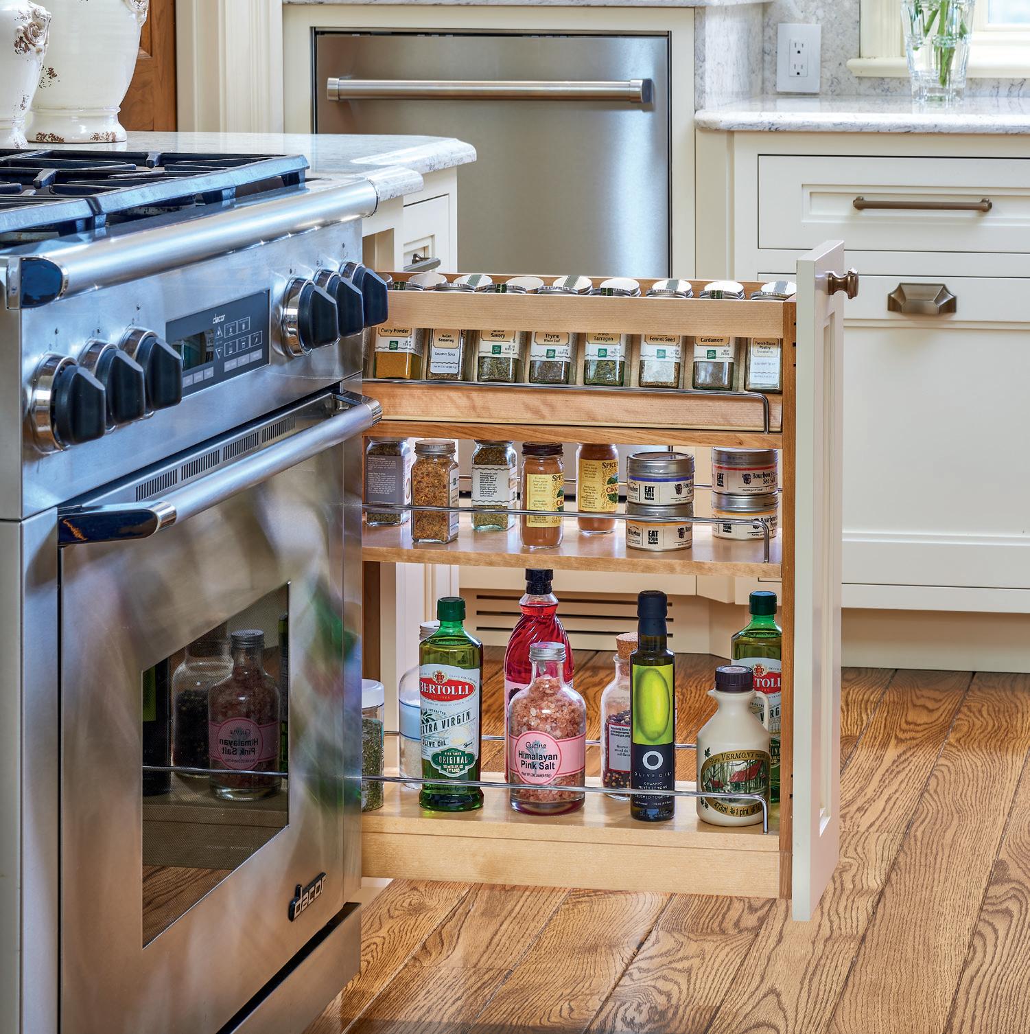 Complete with BLUM MOVENTO soft-close slides and patented door-mount brackets (US Patent No. 8,388,076), this innovative pullout organizer brings timeless craftsmanship with a modern touch and easy organization to your kitchen.