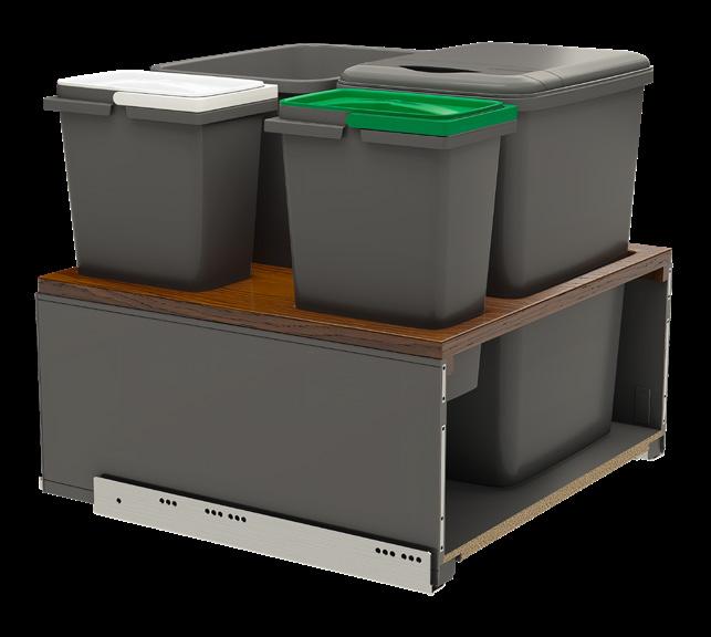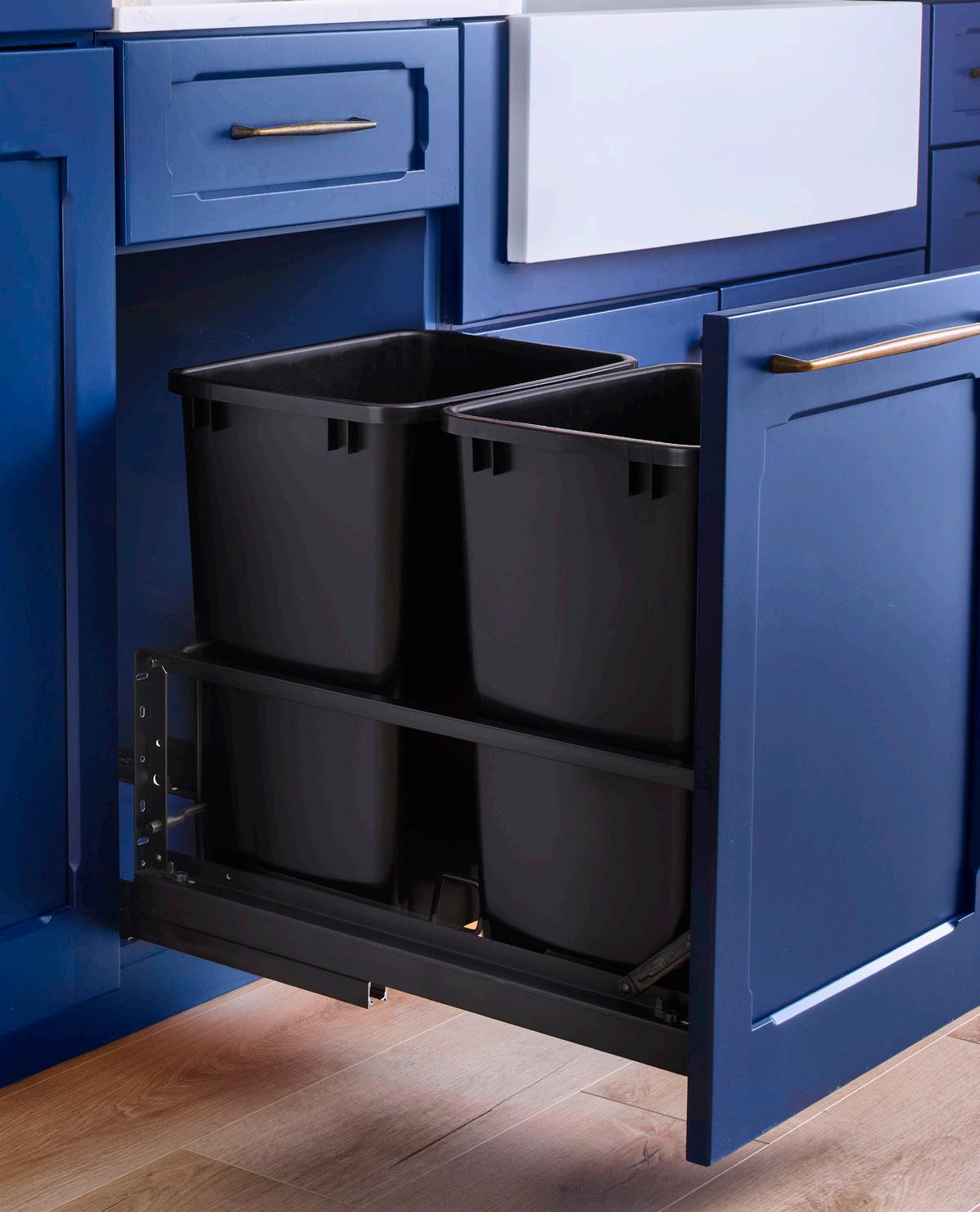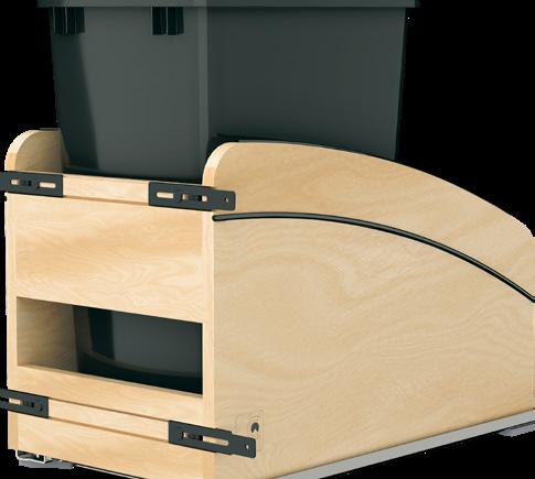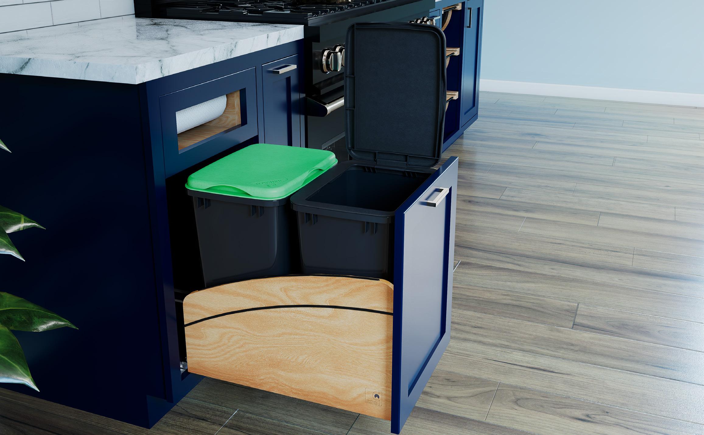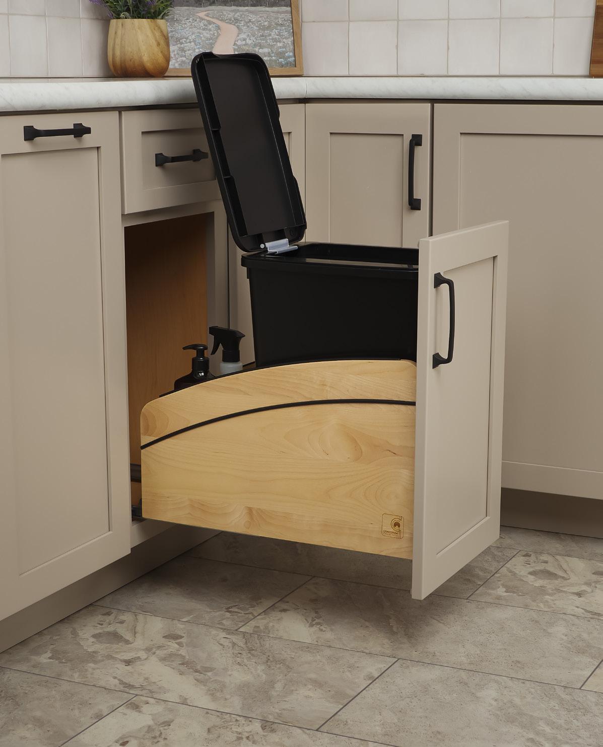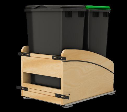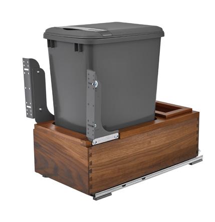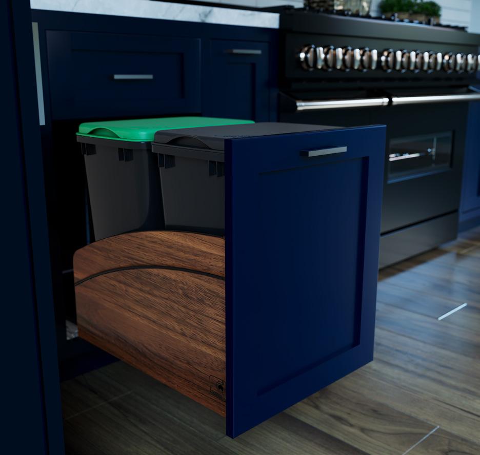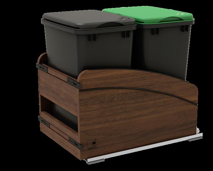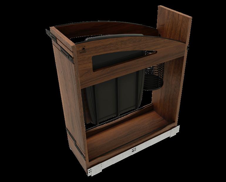 Designed for 9” and 12” base cabinets, now offered in walnut or maple, with decorative radius on either side of the pullout holds the BPA-free black polypropylene waste containers securely in place. The black door-mount brackets are integrated into the frame, giving a clean visual appearance. This unit glides on BLUM MOVENTO softclose slides for smooth operation.
