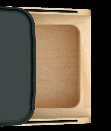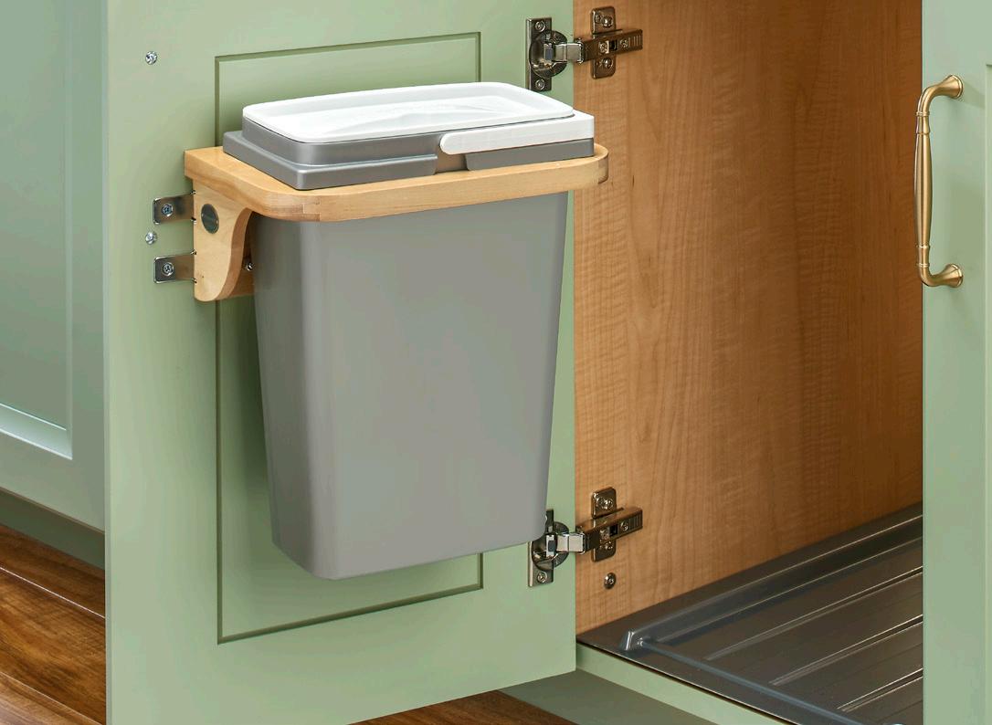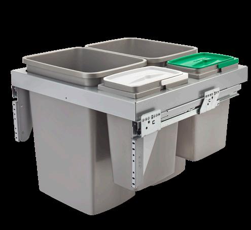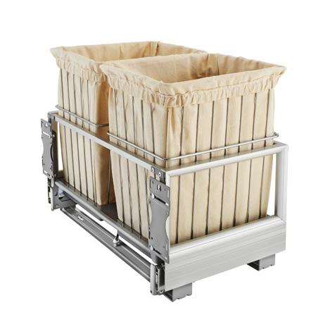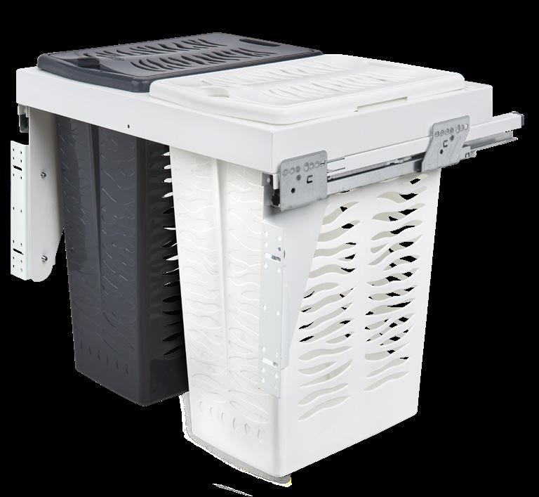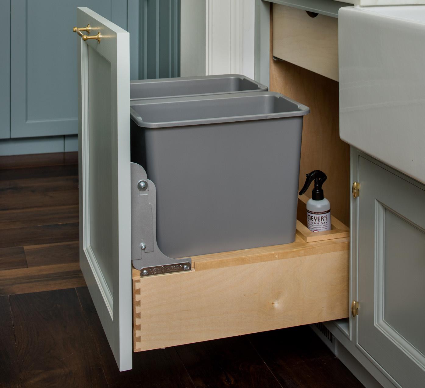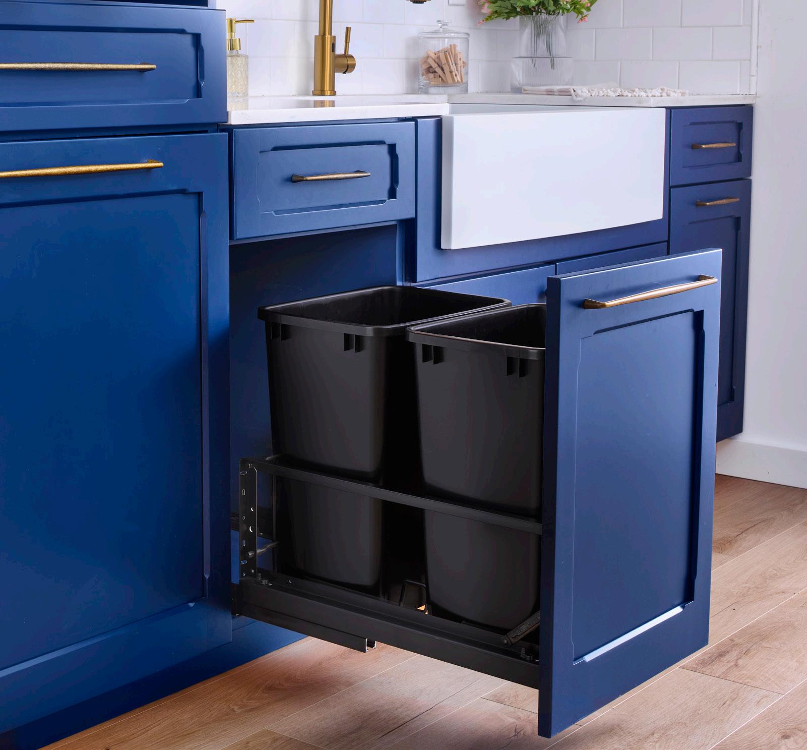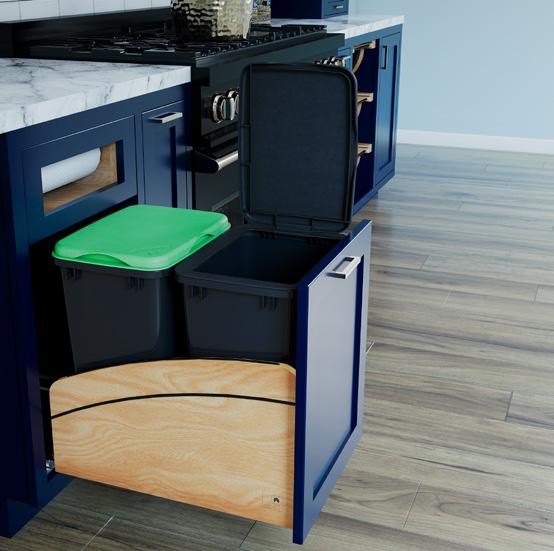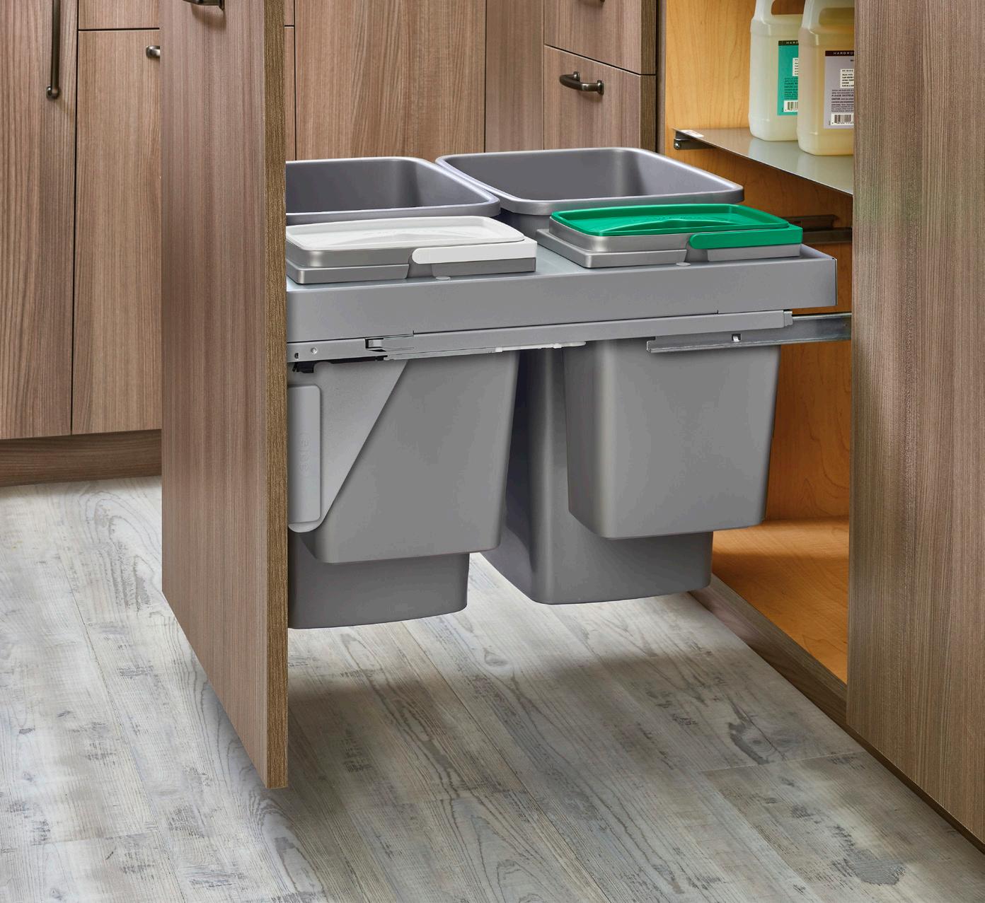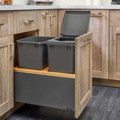 Designed for 9” and 12” base cabinets, now offered in walnut or maple, with decorative radius on either side of the pullout holds the BPA-free black polypropylene waste containers securely in place. The black door-mount brackets are integrated into the frame, giving a clean visual appearance. This unit glides on BLUM MOVENTO softclose slides for smooth operation.