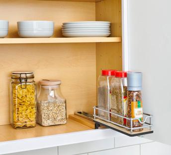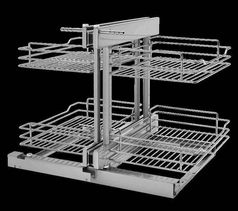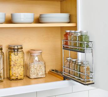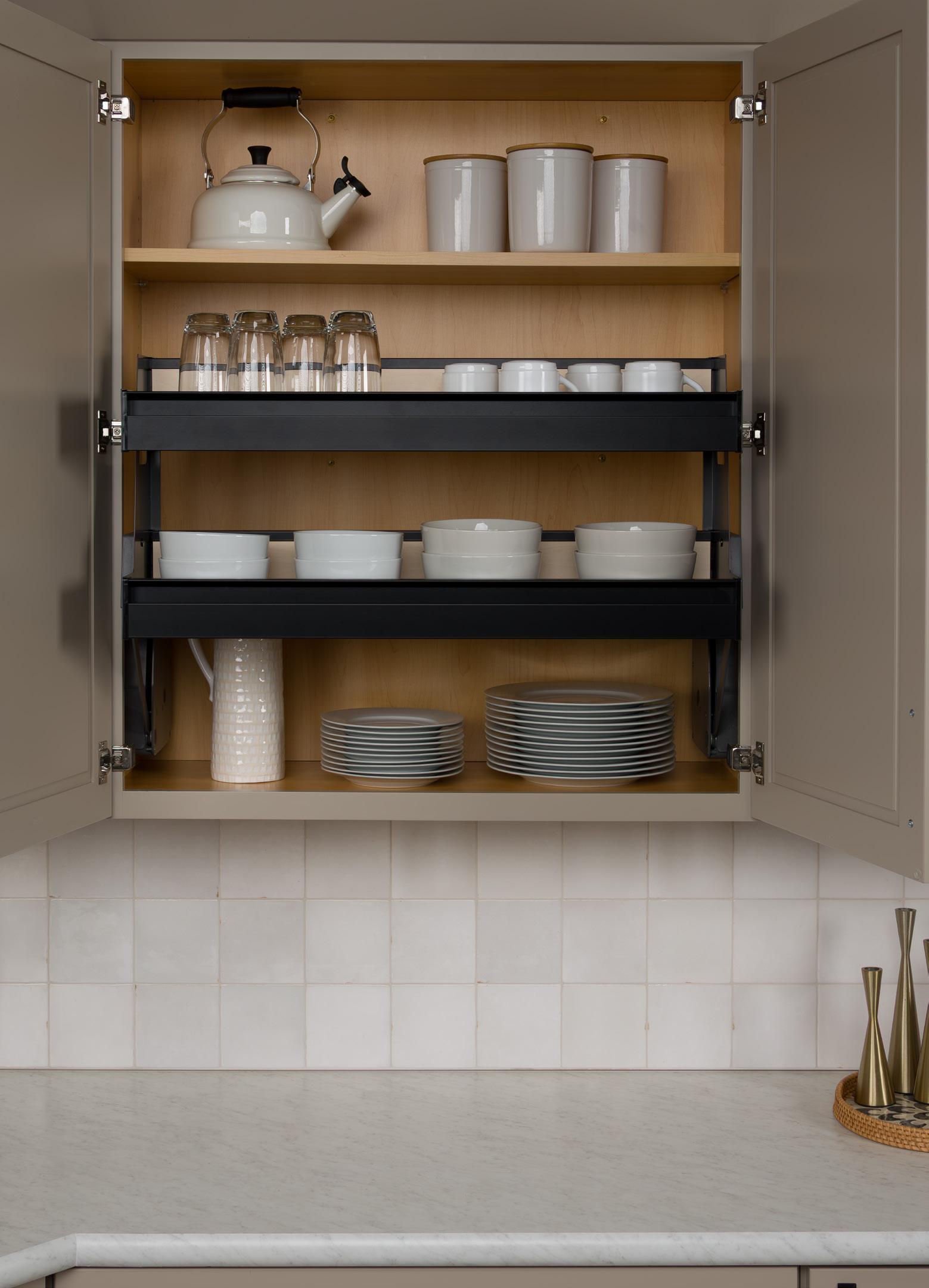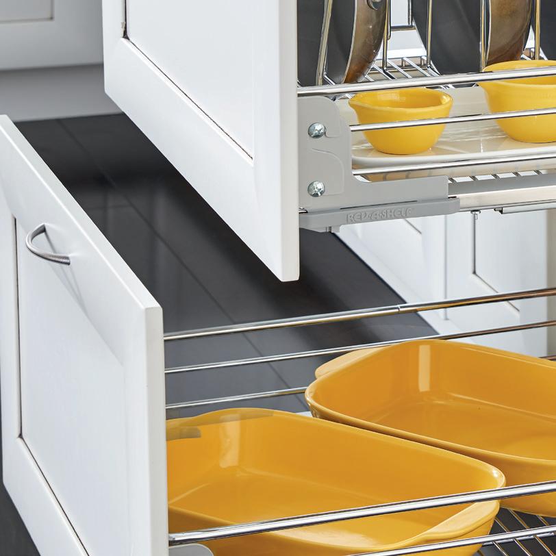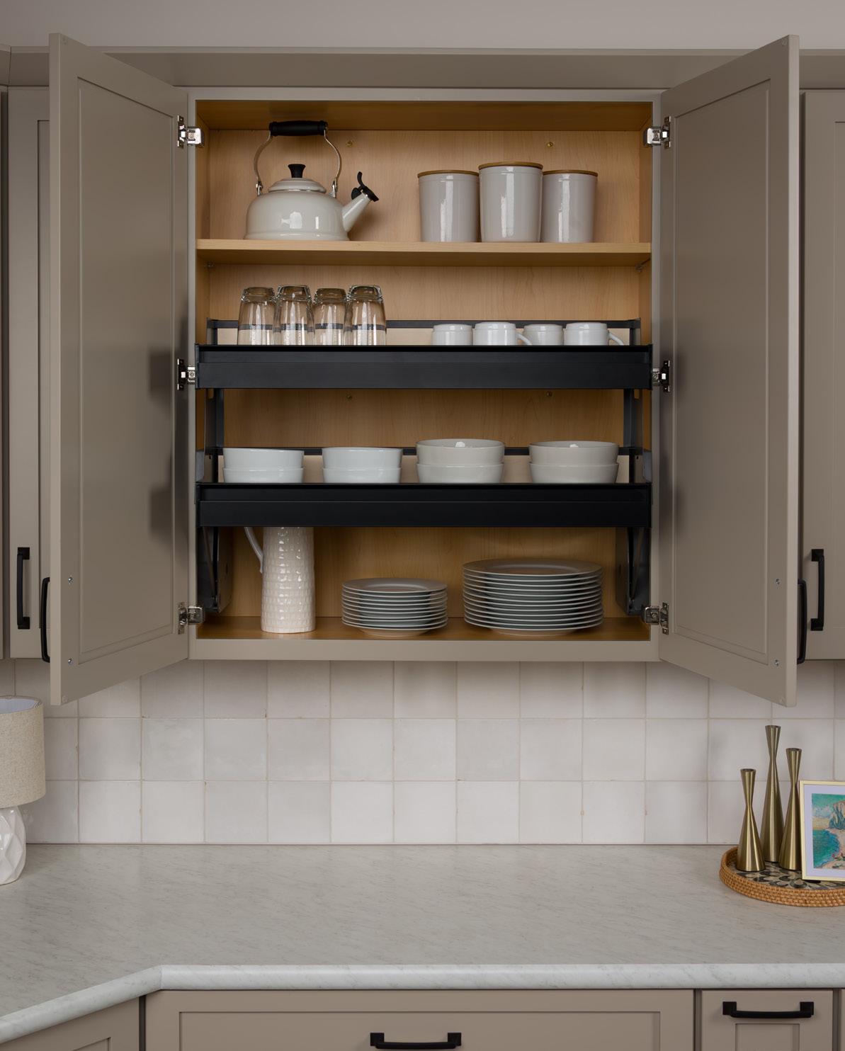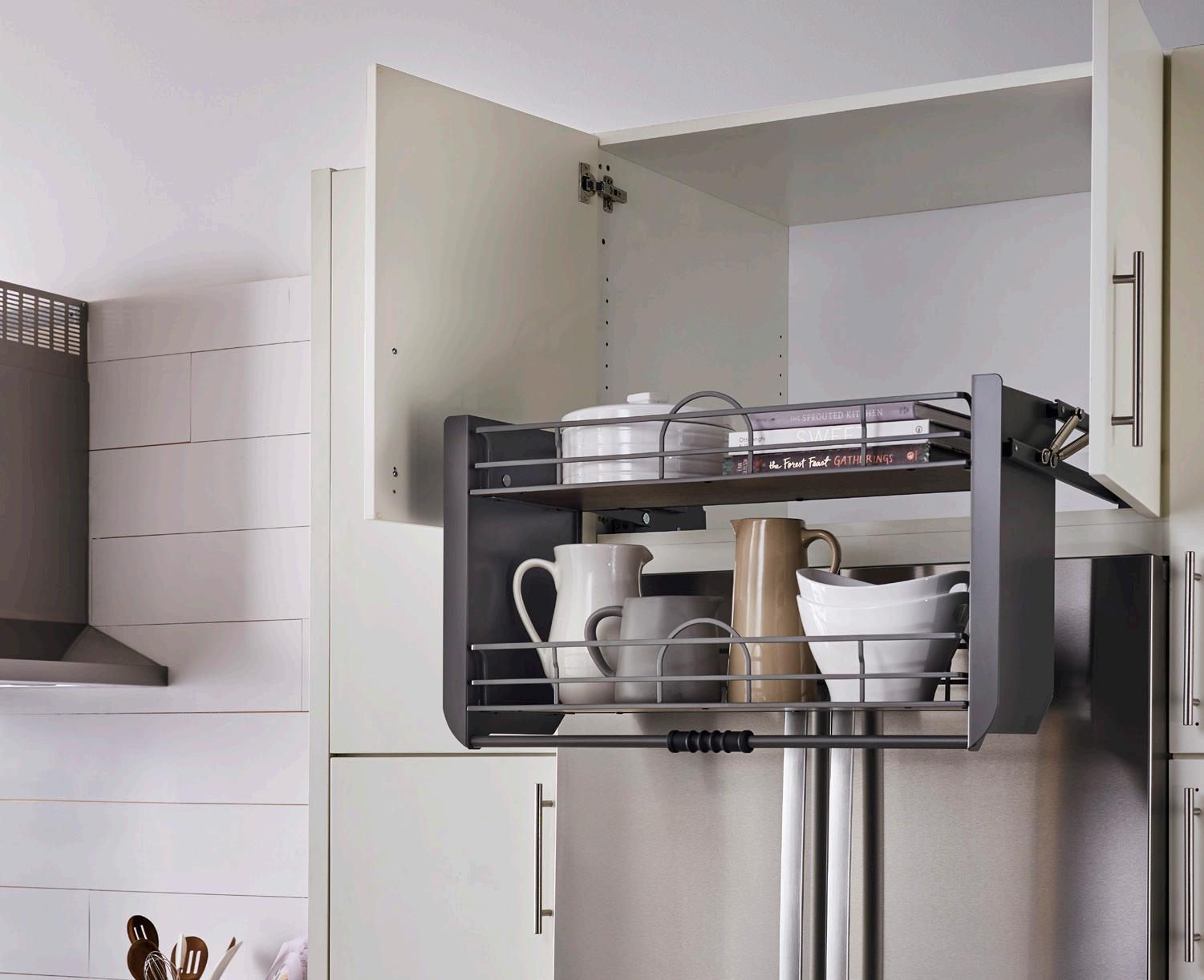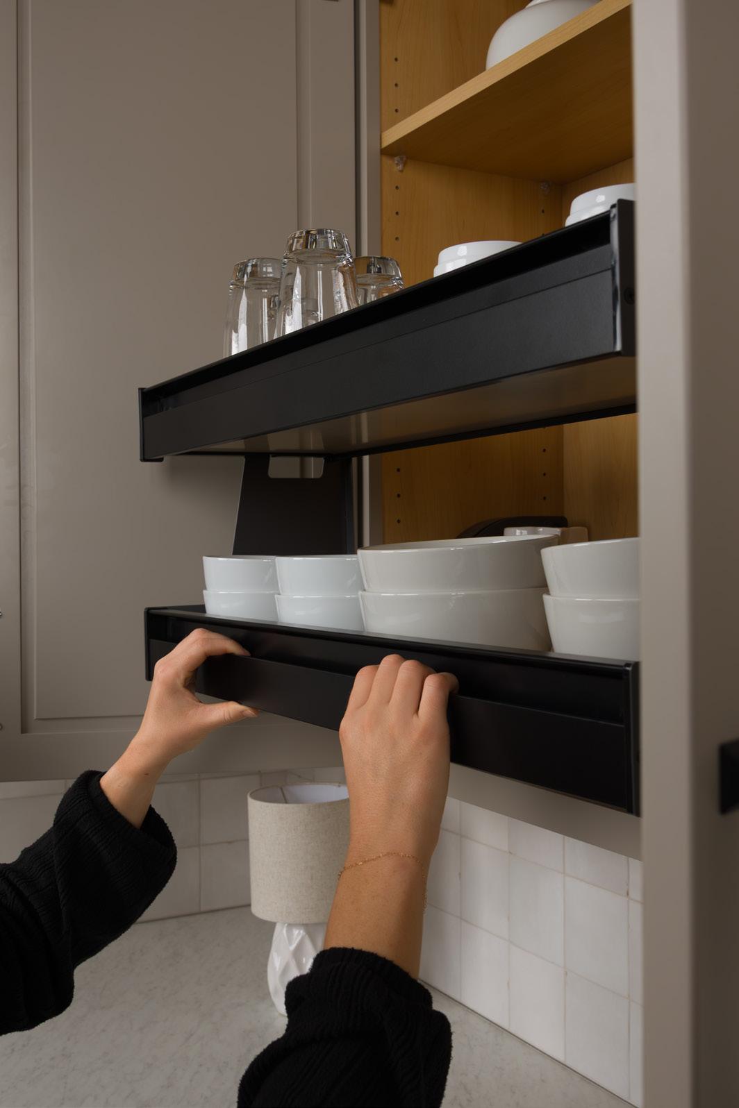 Revamp your kitchen storage with the sleek and trimmable Yo-Yo Pull-Down Shelving System. Designed for wall cabinets, this space-saving system offers smooth, gas-spring-assisted operation and a sidemount design that maximizes storage space.