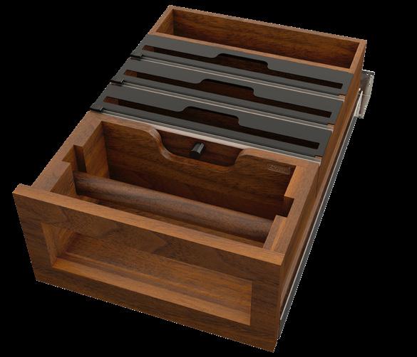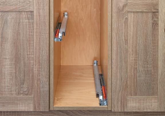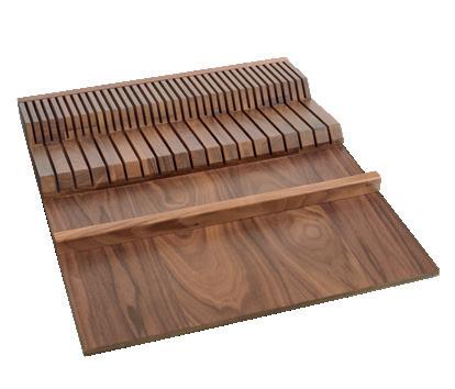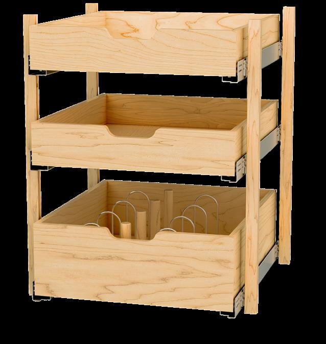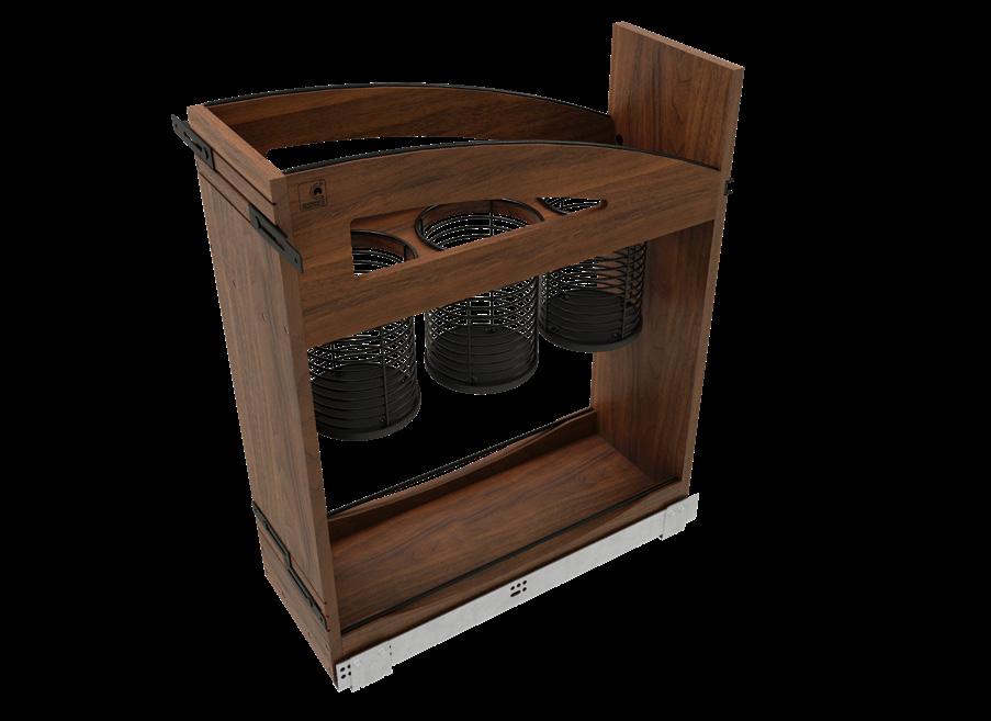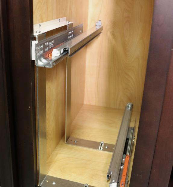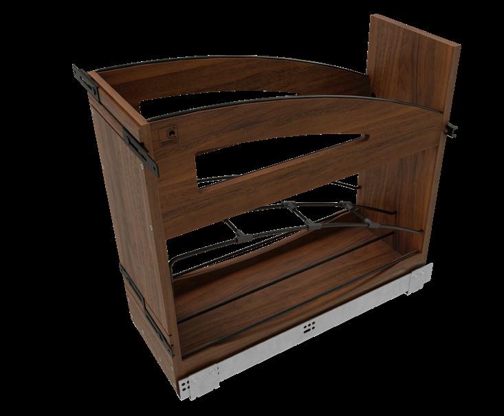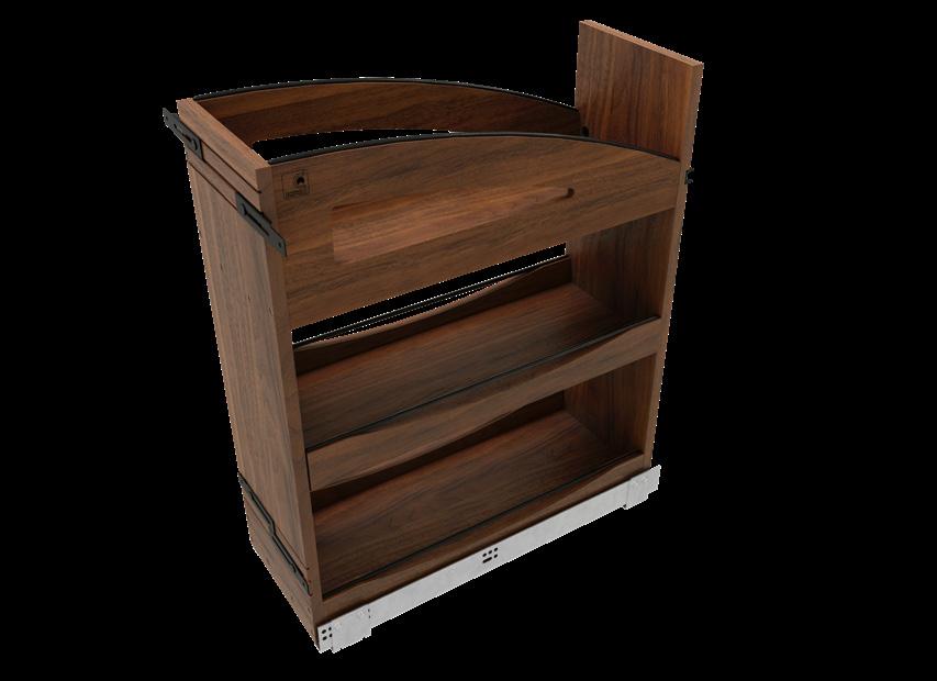 Designed for 9” and 12” base cabinets, now offered in walnut or maple with concealed rear backstops that provide extra safety and stability, patented door-mount brackets (US Patent No. 8,388,076) and BLUM MOVENTO softclose slides that provide smooth operation and easy installation.