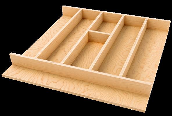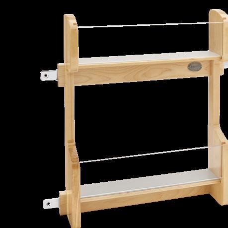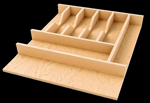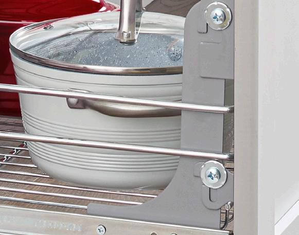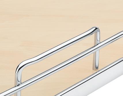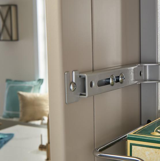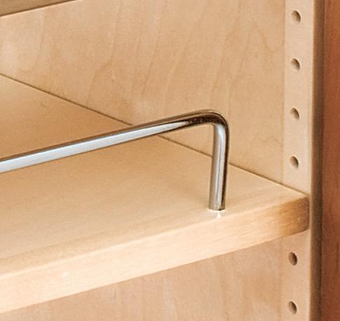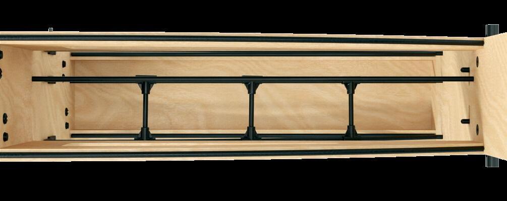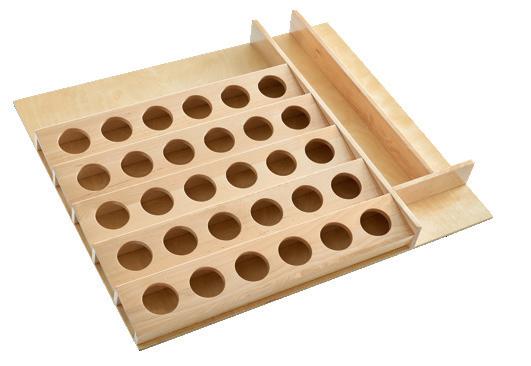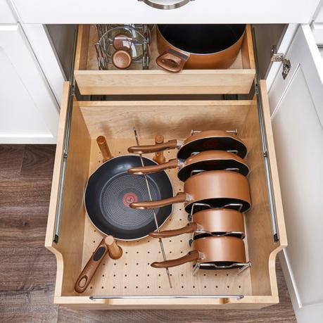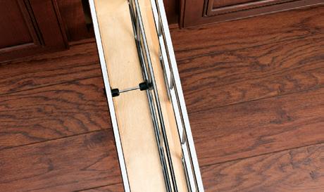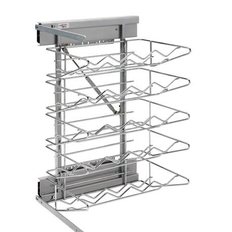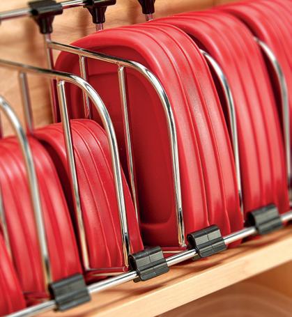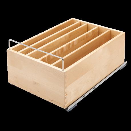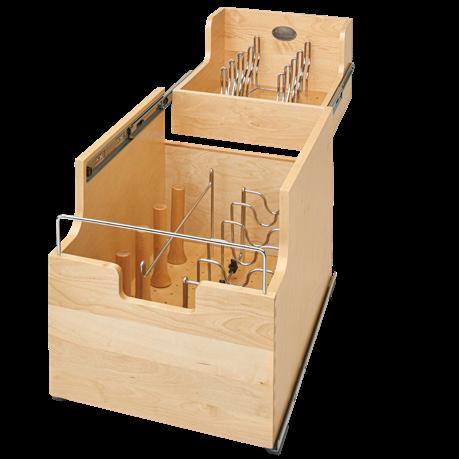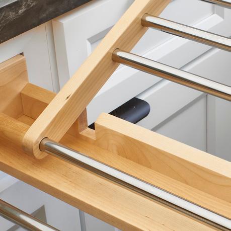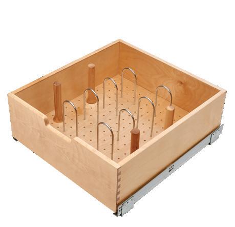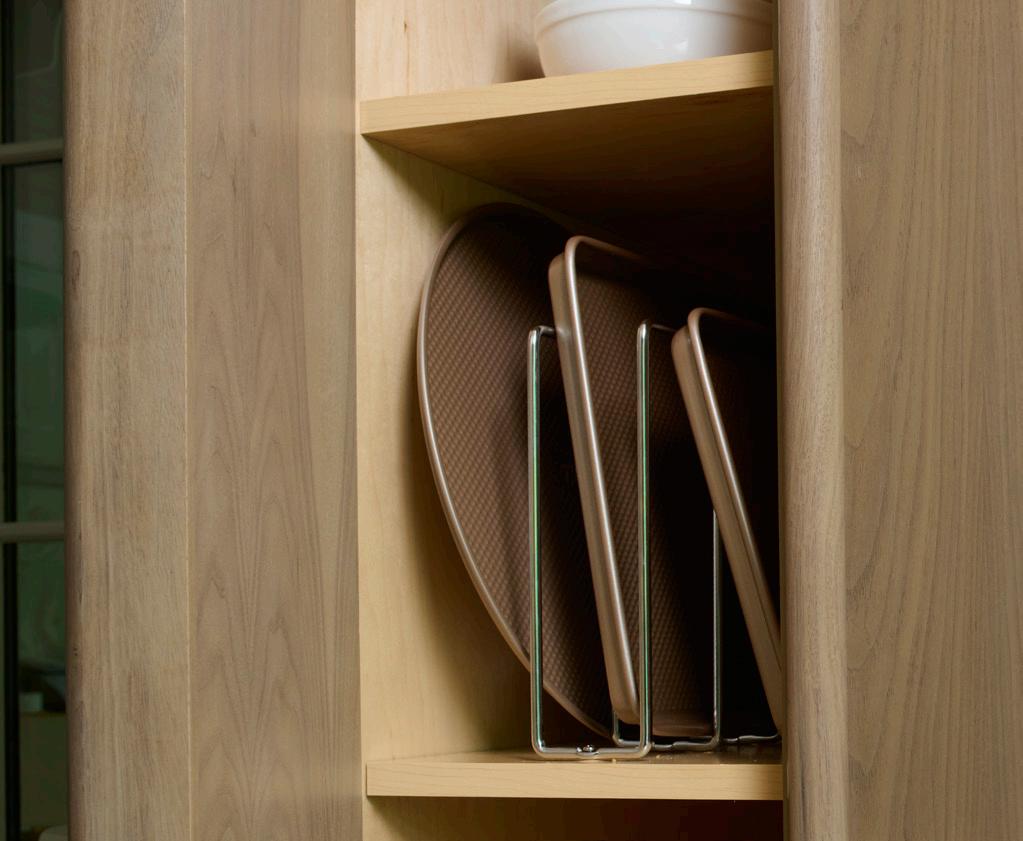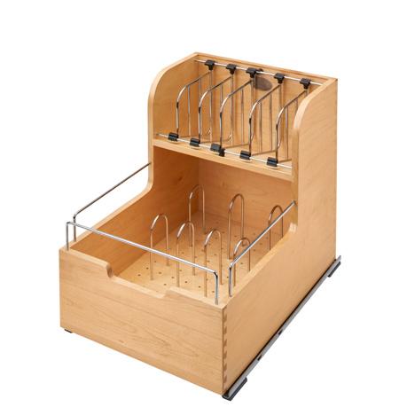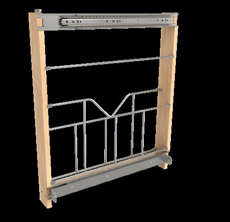 Designed for 9” and 12” base cabinets, now offered in walnut or maple with patented door-mount brackets (US Patent No. 8,388,076), concealed rear stops that provide extra safety and stability, one fixed divider for bakeware and three removable, adjustable T-Bars for foil, plastic wrap, food storage bags and more.