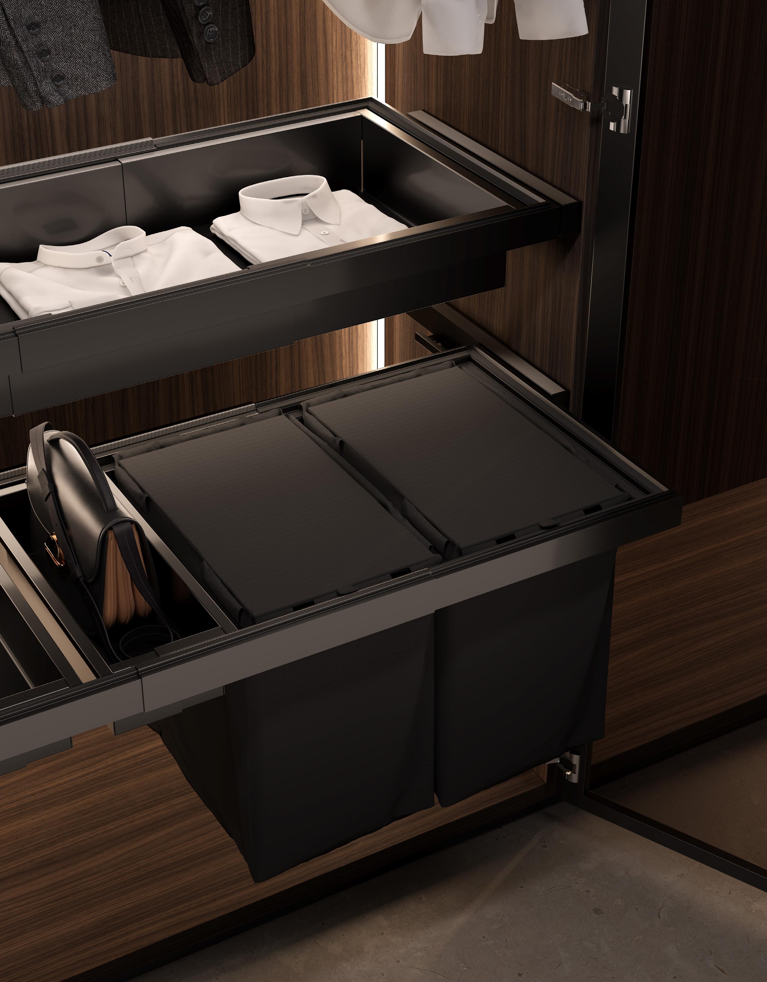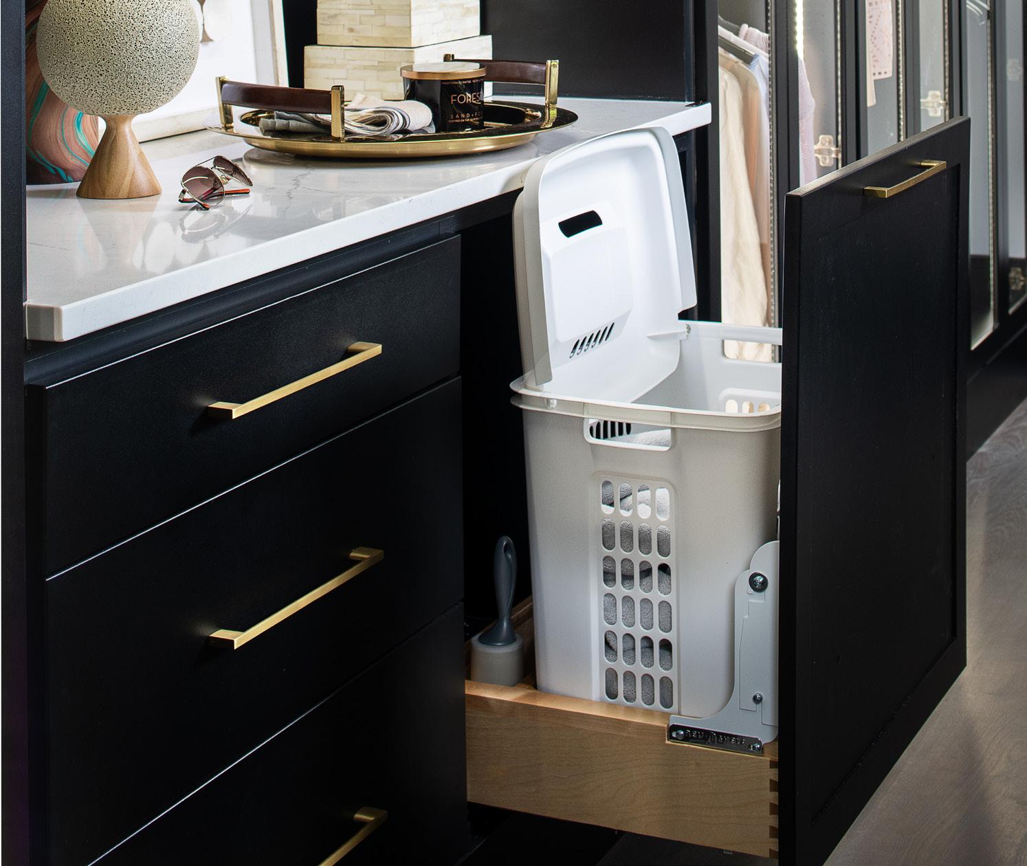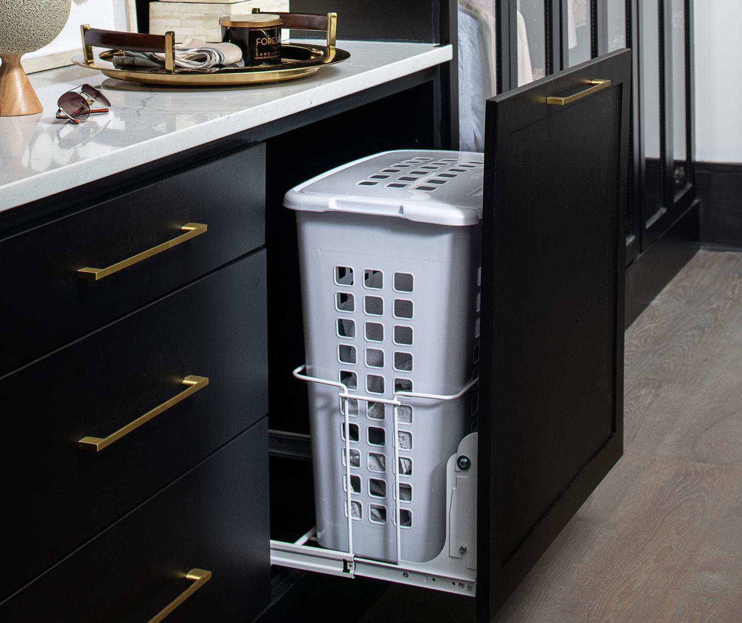 This pullout organizer combines refined aesthetics with practicality, showcasing furniture-grade soft edges, solid wood construction, and recessed black wire accents that add a modern touch.