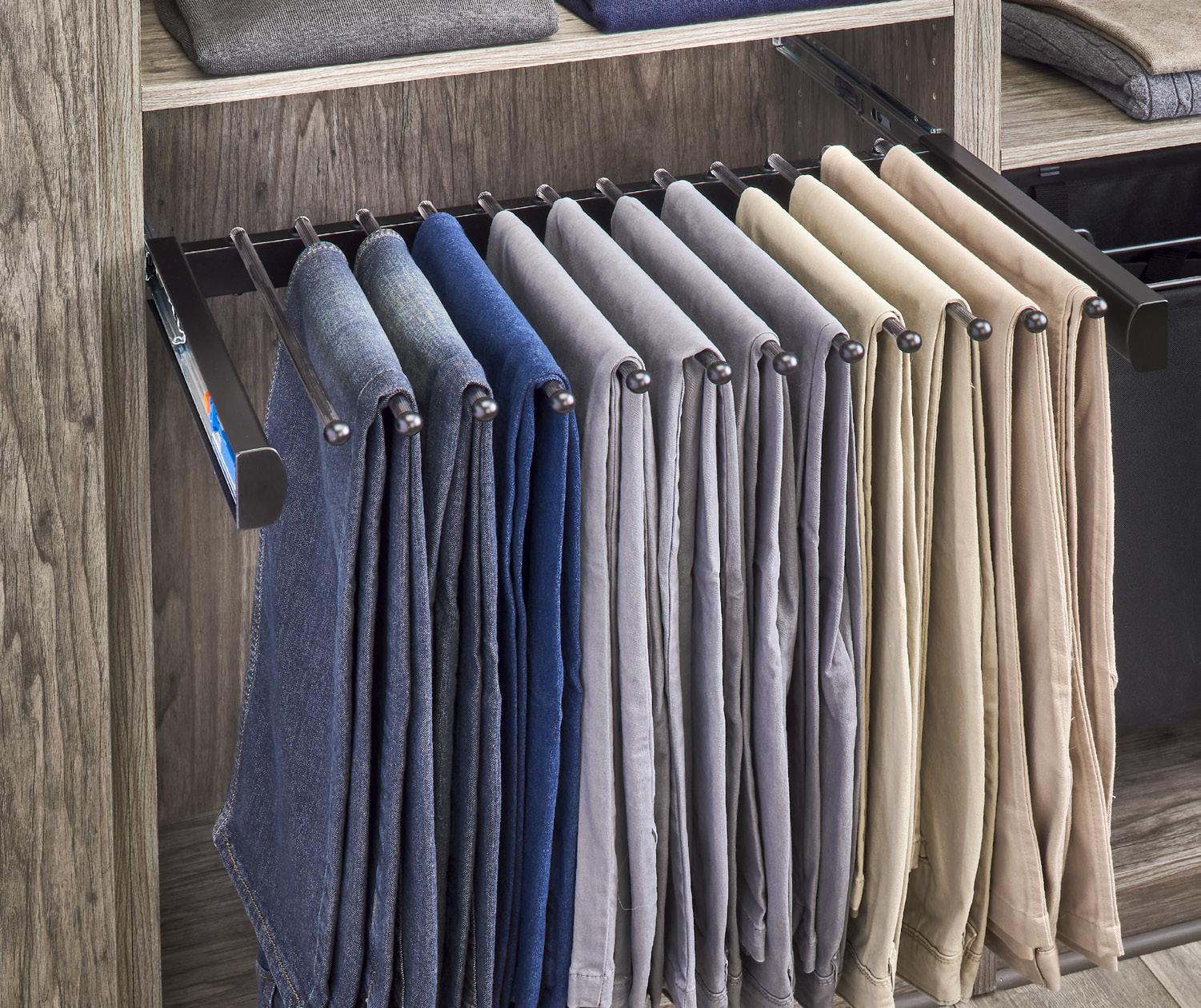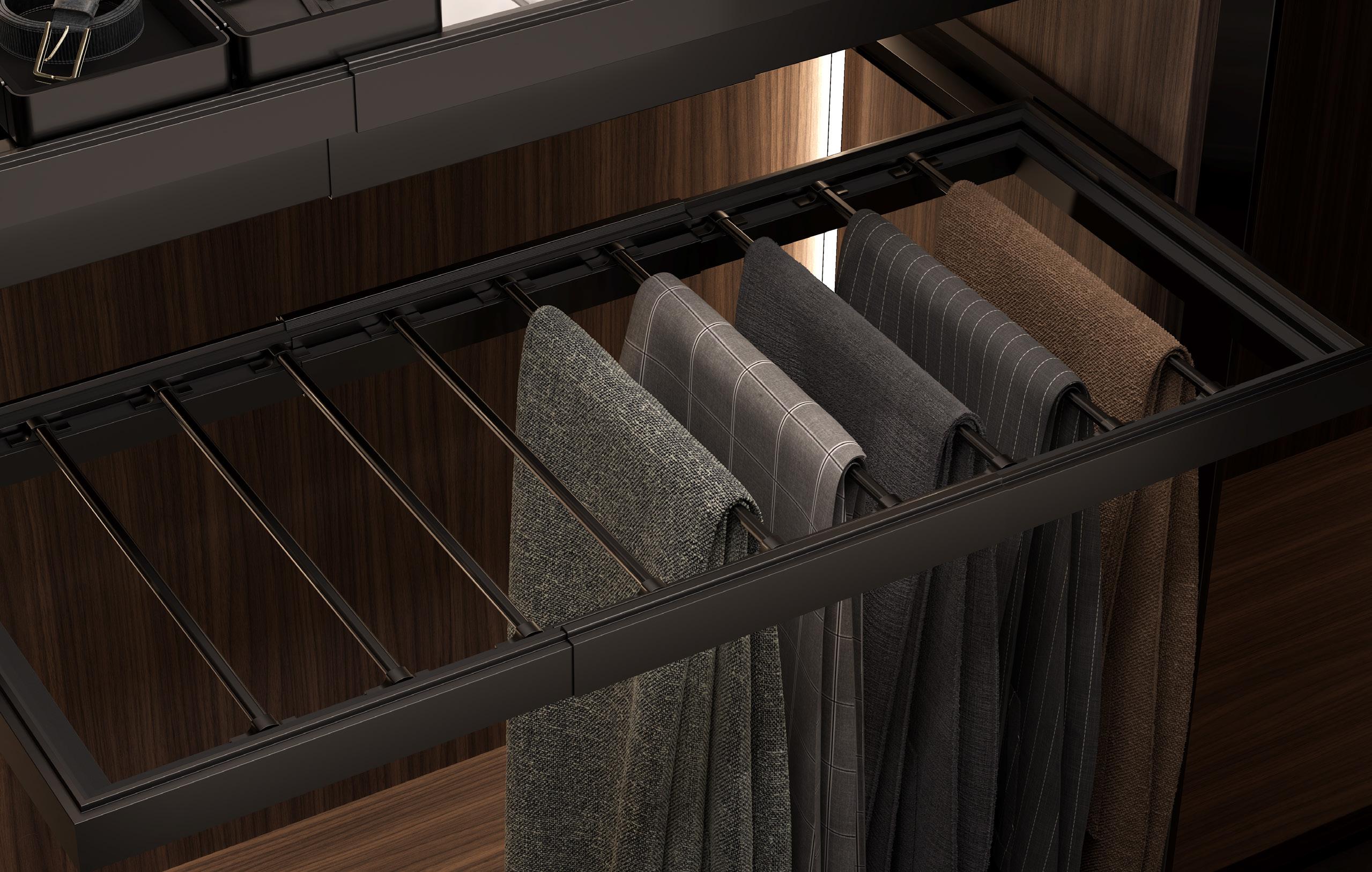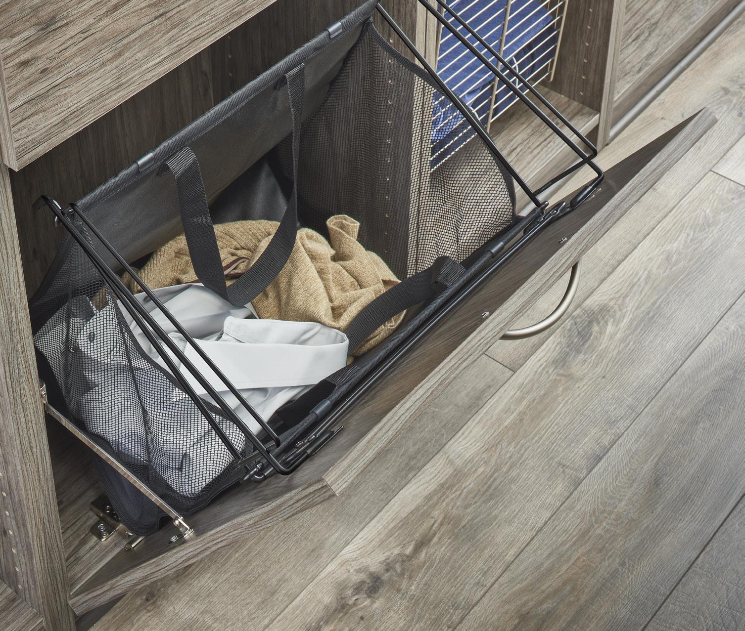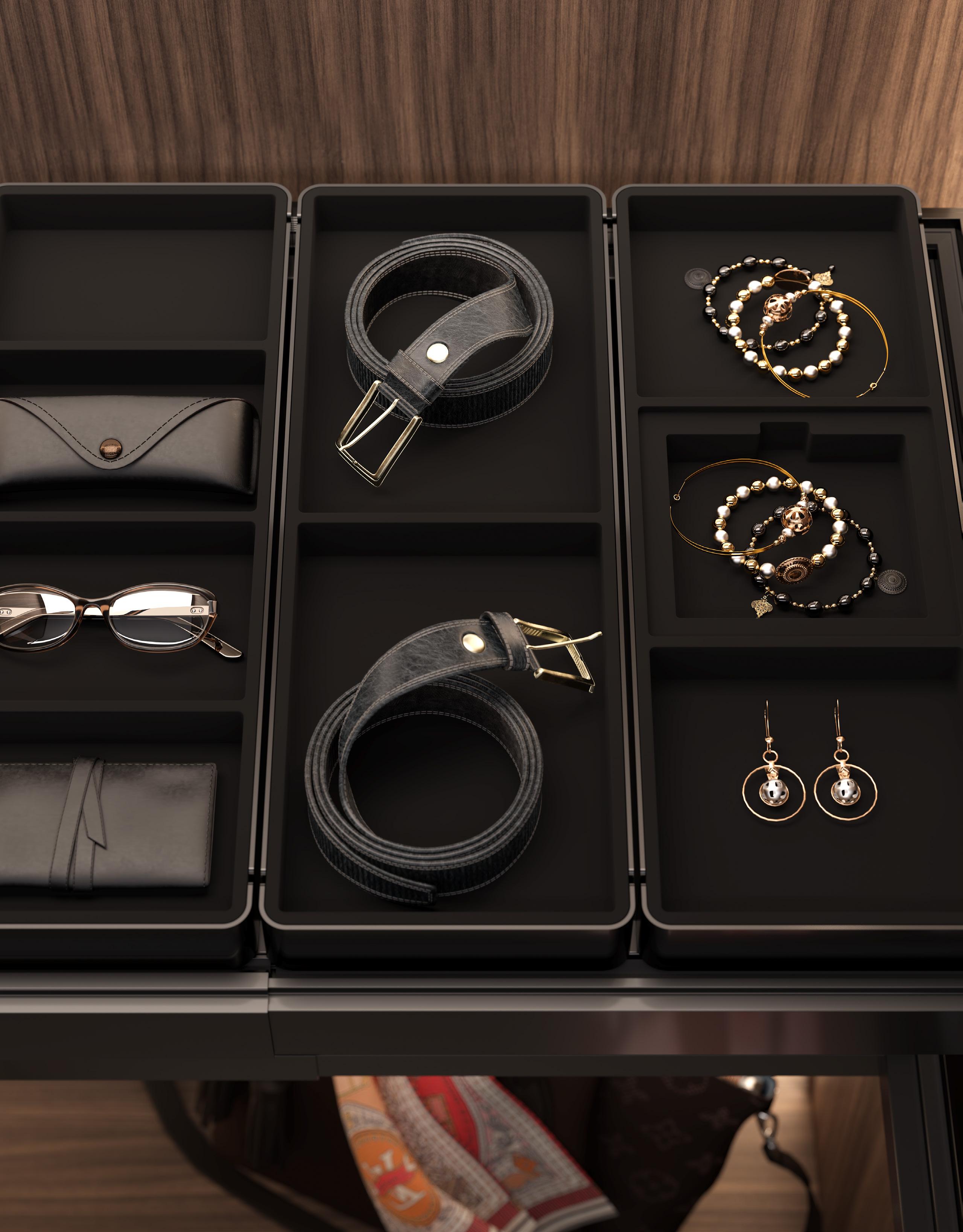 This pullout organizer combines refined aesthetics with practicality, showcasing furniture-grade soft edges, solid wood construction, and recessed black wire accents that add a modern touch.