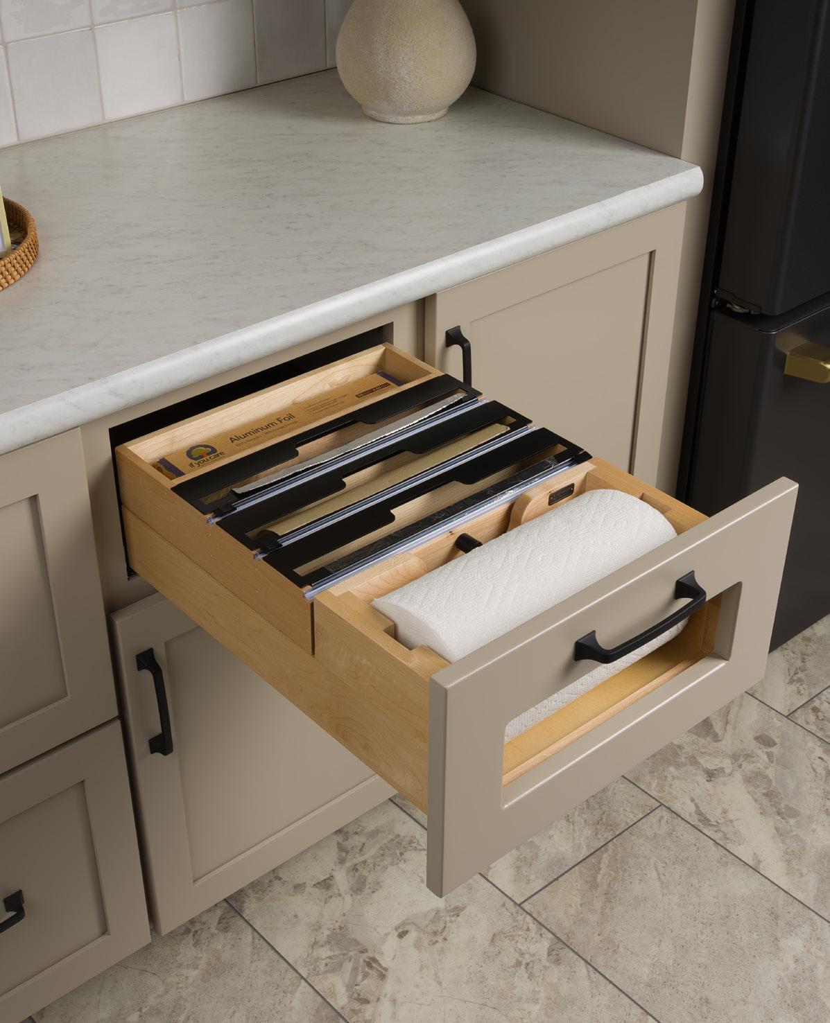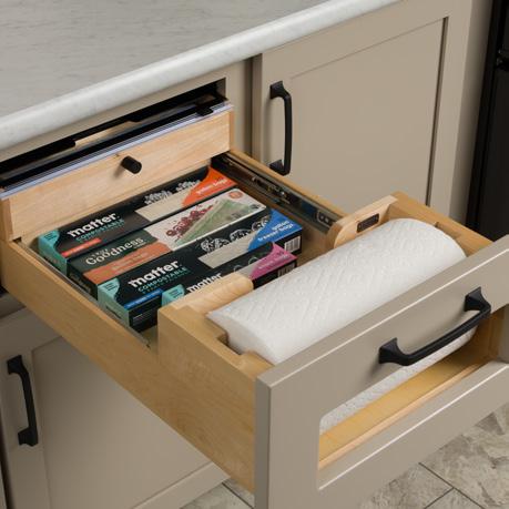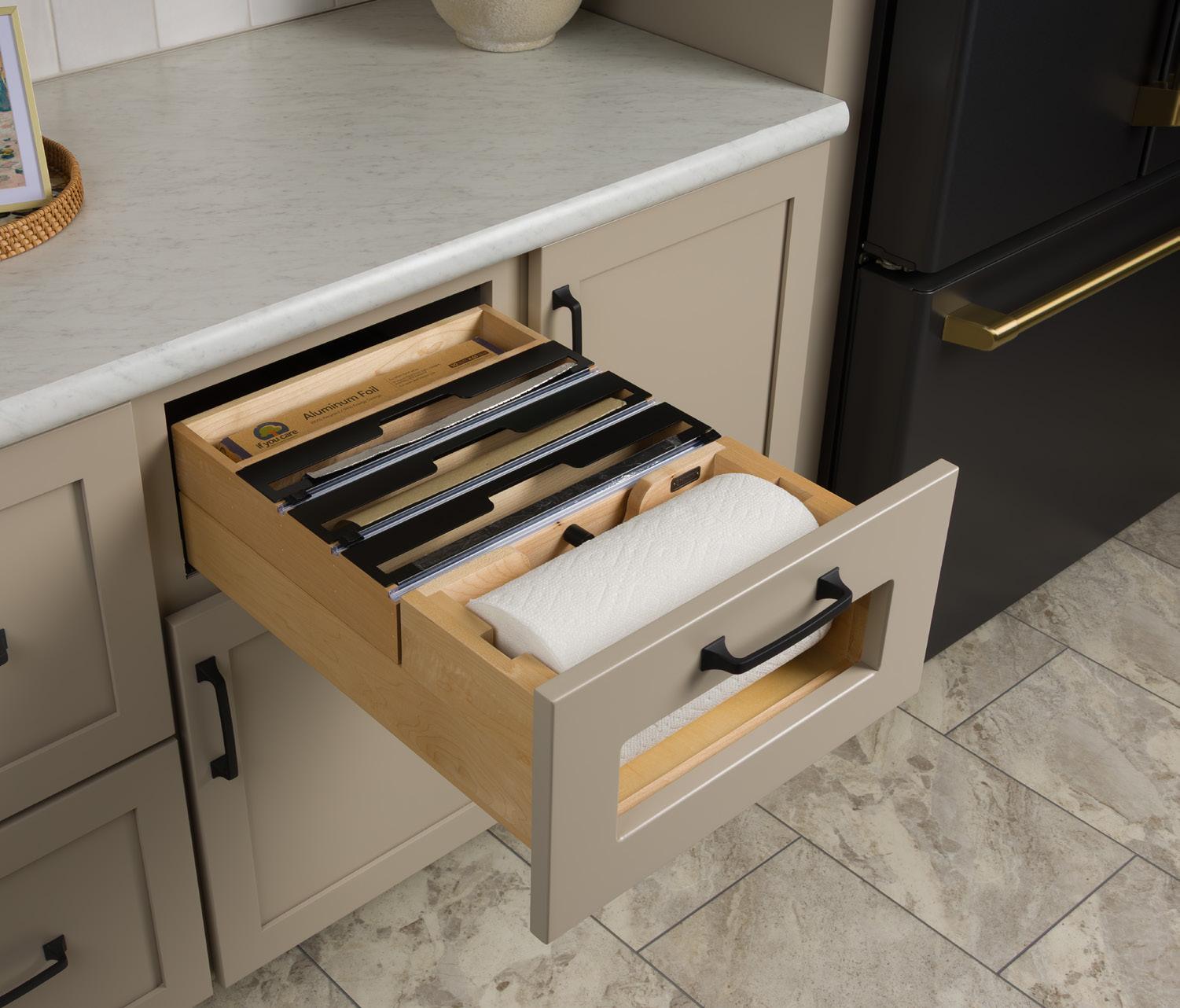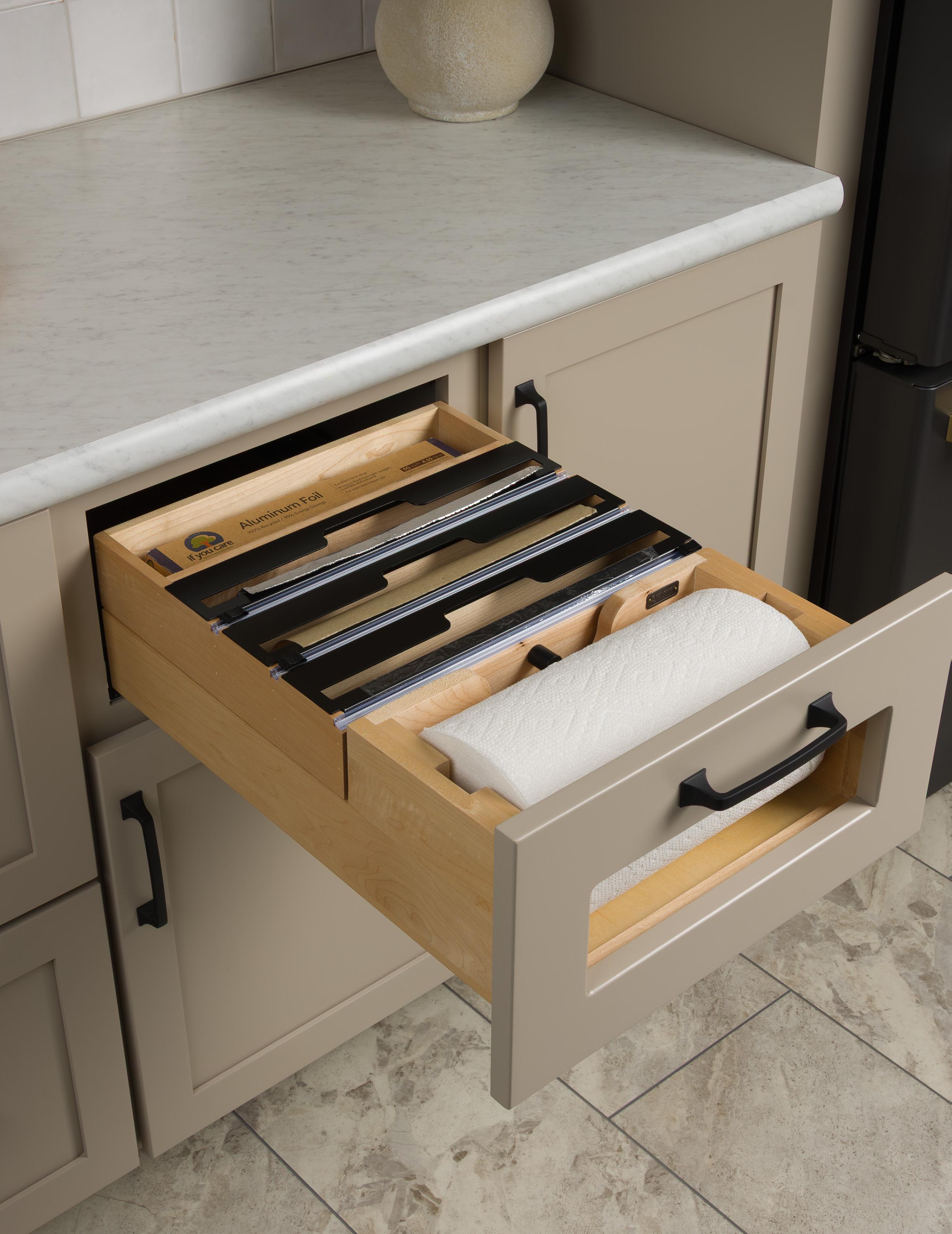 Stop struggling with hard-to-store boxes of aluminum foil, plastic wrap, parchment paper and more. Restore order to your drawers with the all-new design 4FWI Series Foil Wrap Insert from Rev-A-Shelf ®