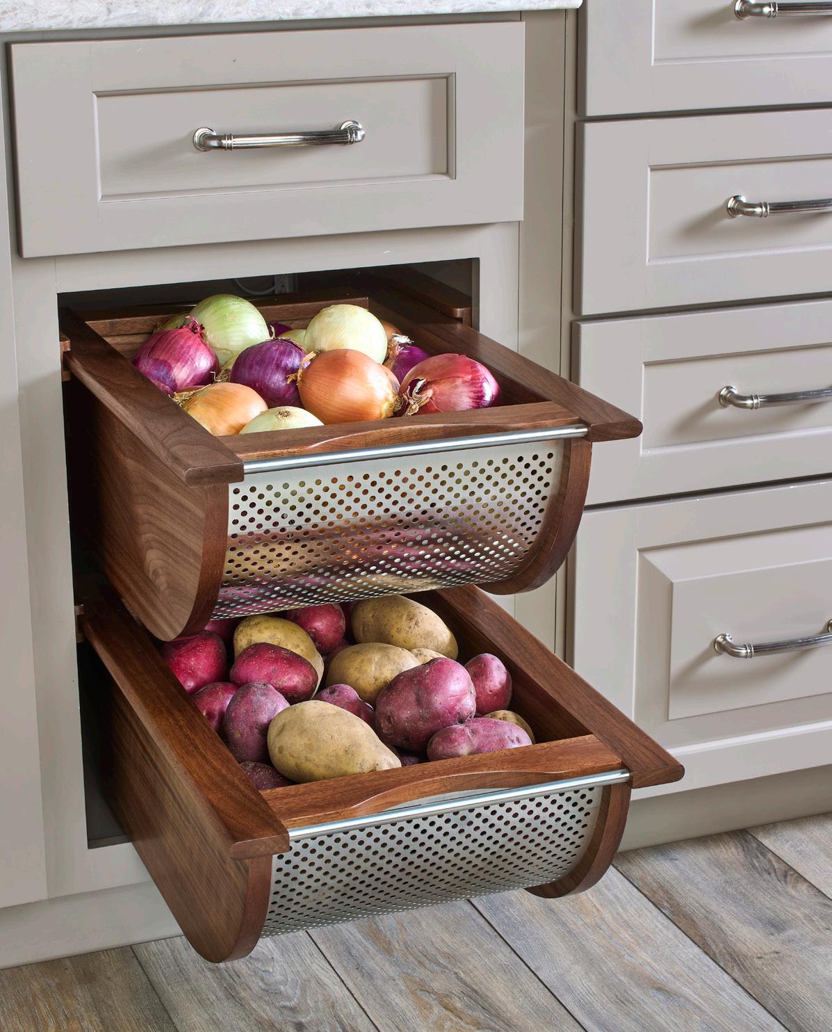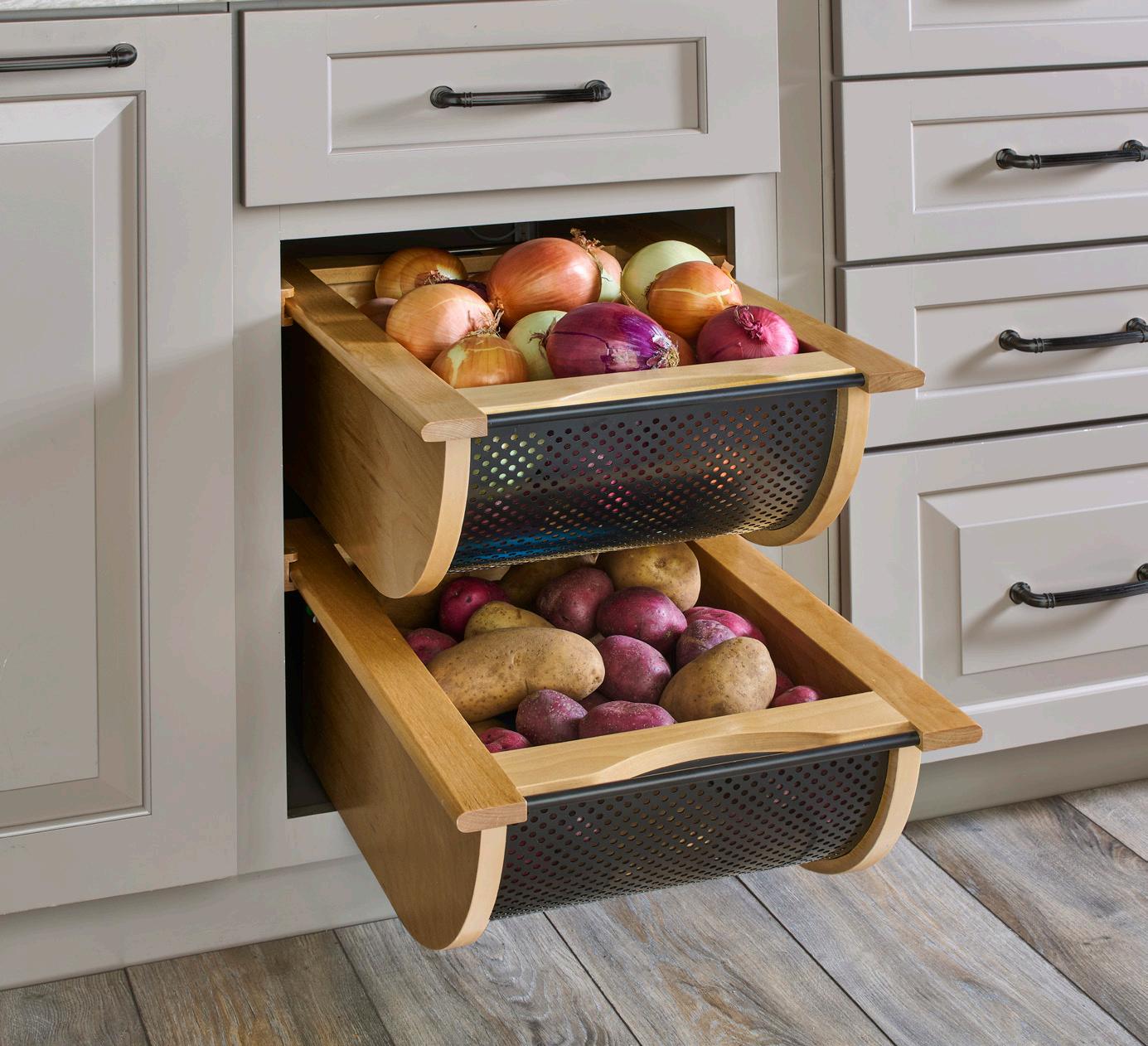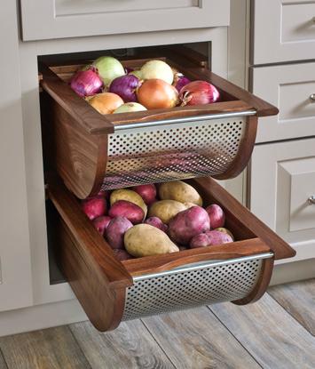 Store your produce in style with the 4SSB Series Stainless-Steel Produce Baskets! These removable baskets are designed for base cabinets and intended for use without cabinet doors. They are available in your choice of walnut or maple construction and feature either a stainless-steel bottom with matching handles or a luxurious black bottom with matching handles. The perforated design promotes ample air circulation and prevents moisture buildup, keeping your fruits and vegetables fresher for longer. Enjoy simple installation with trim-to-fit side rails and easy transportation using the built-in handles.