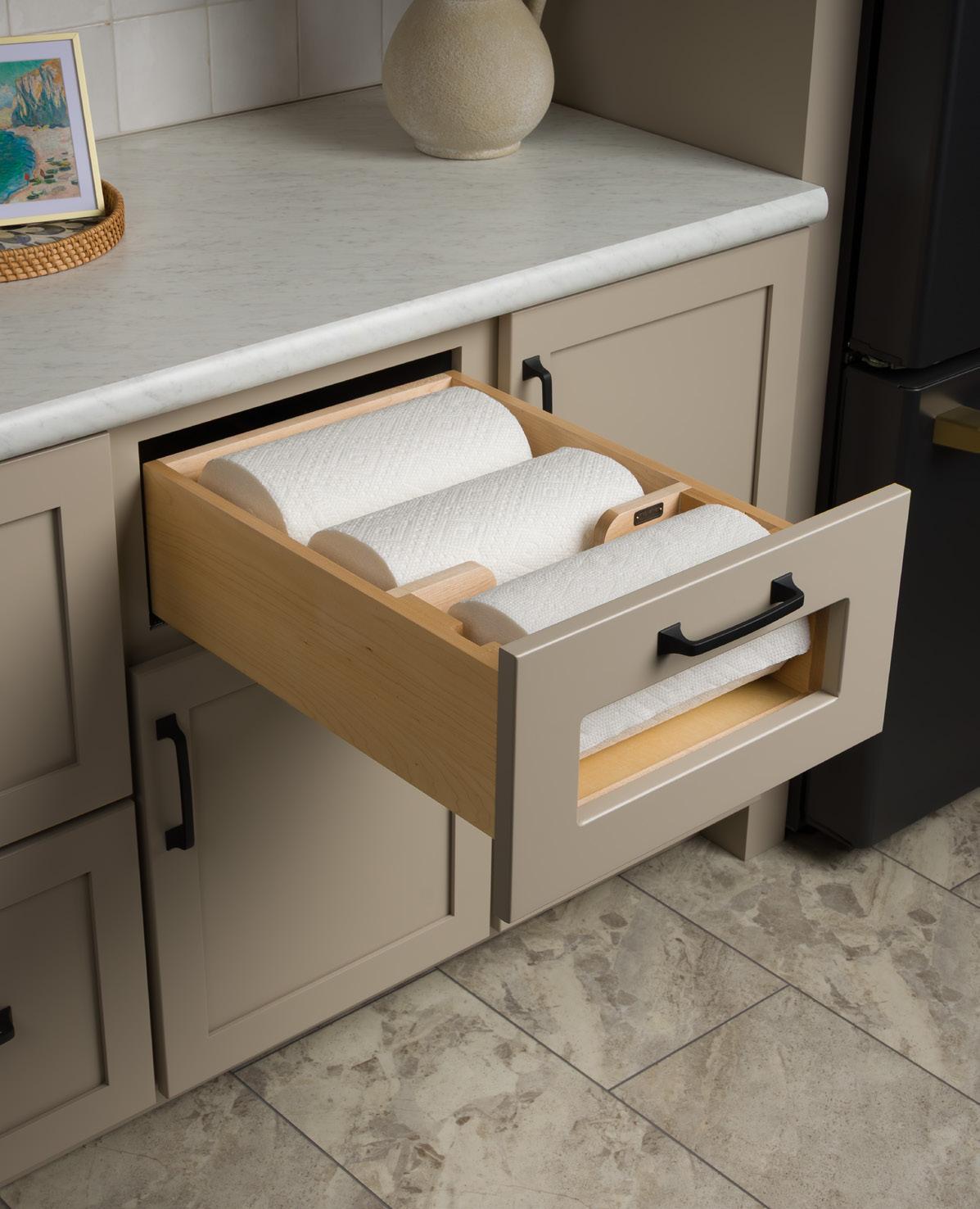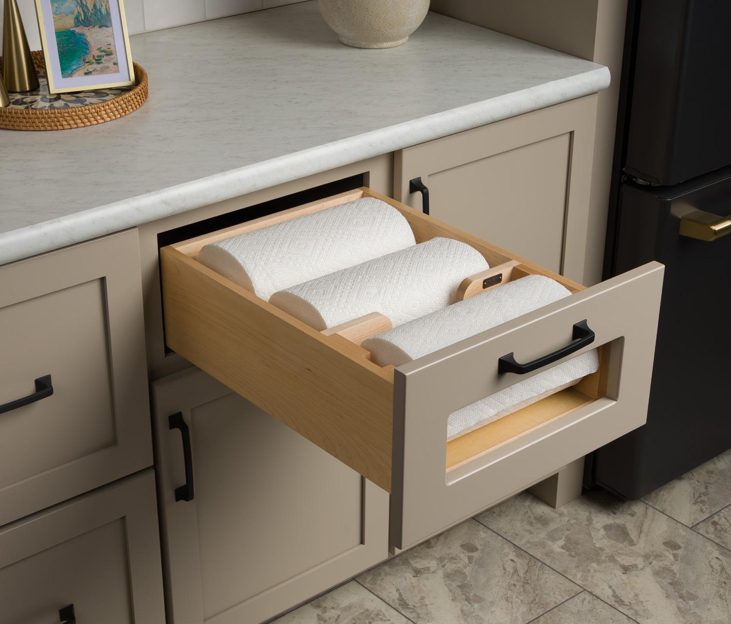 Keep your countertops clutter-free while maintaining easy access to your paper towels with the 4PTTD Series! This innovative tiered drawer system combines organization and convenience, featuring ample storage space, a removable dowel for quick refills and smooth, soft-close slides.