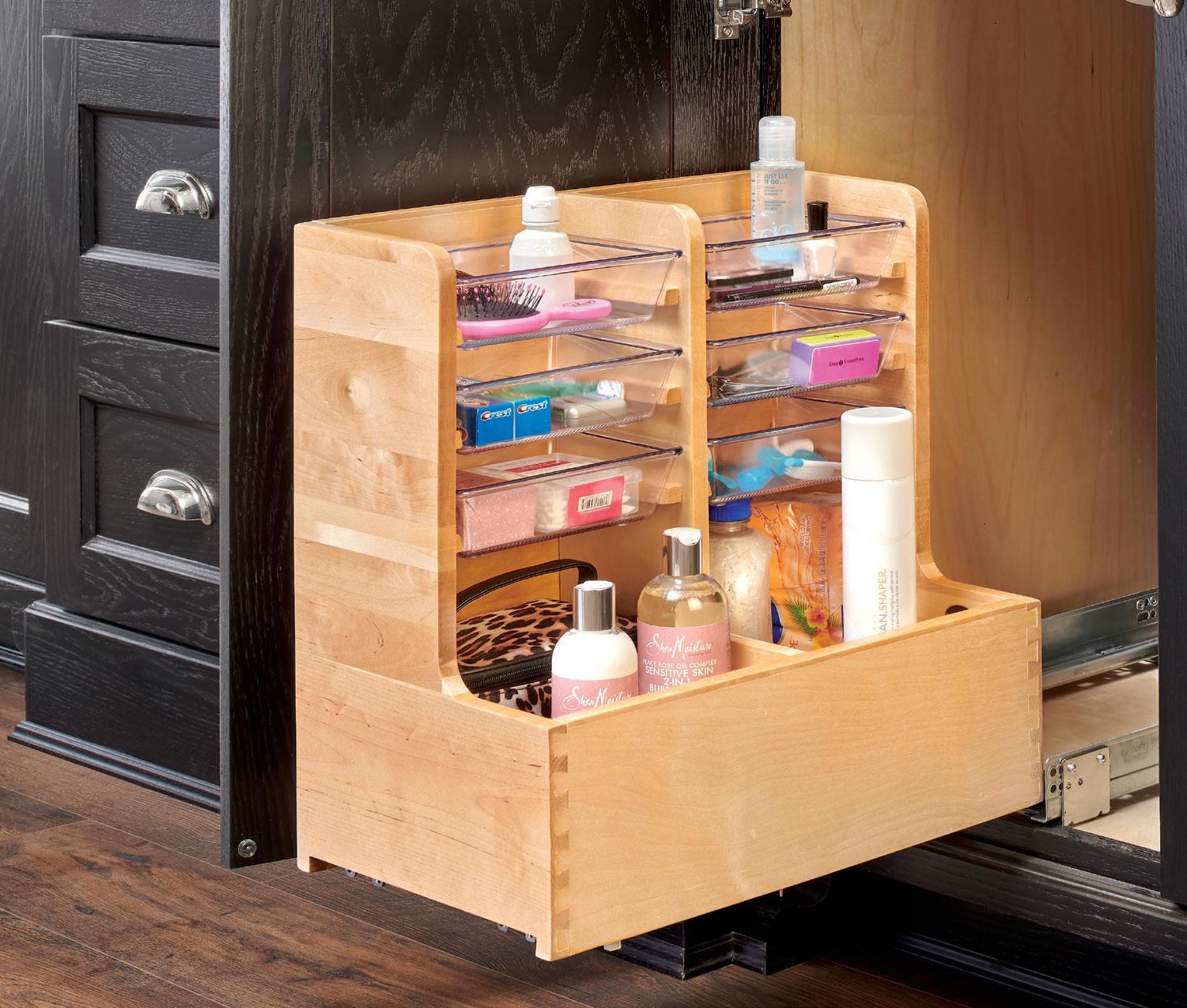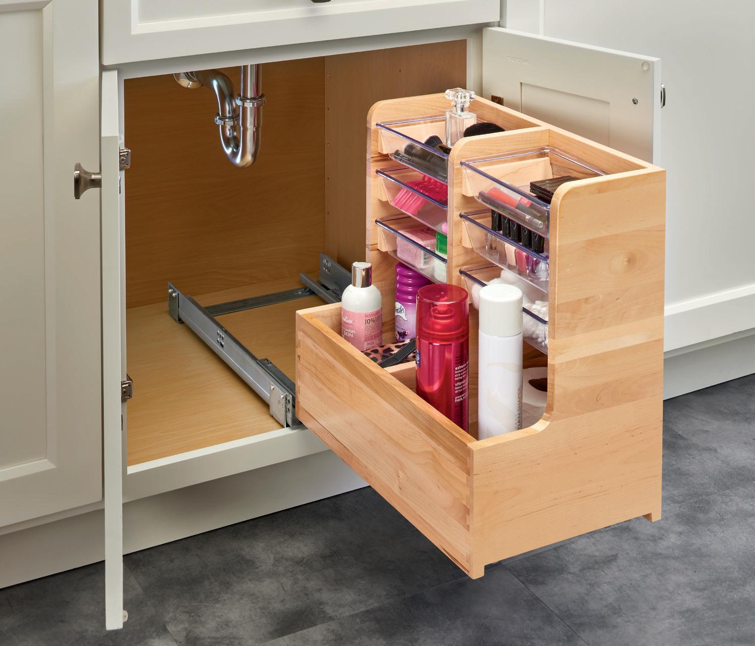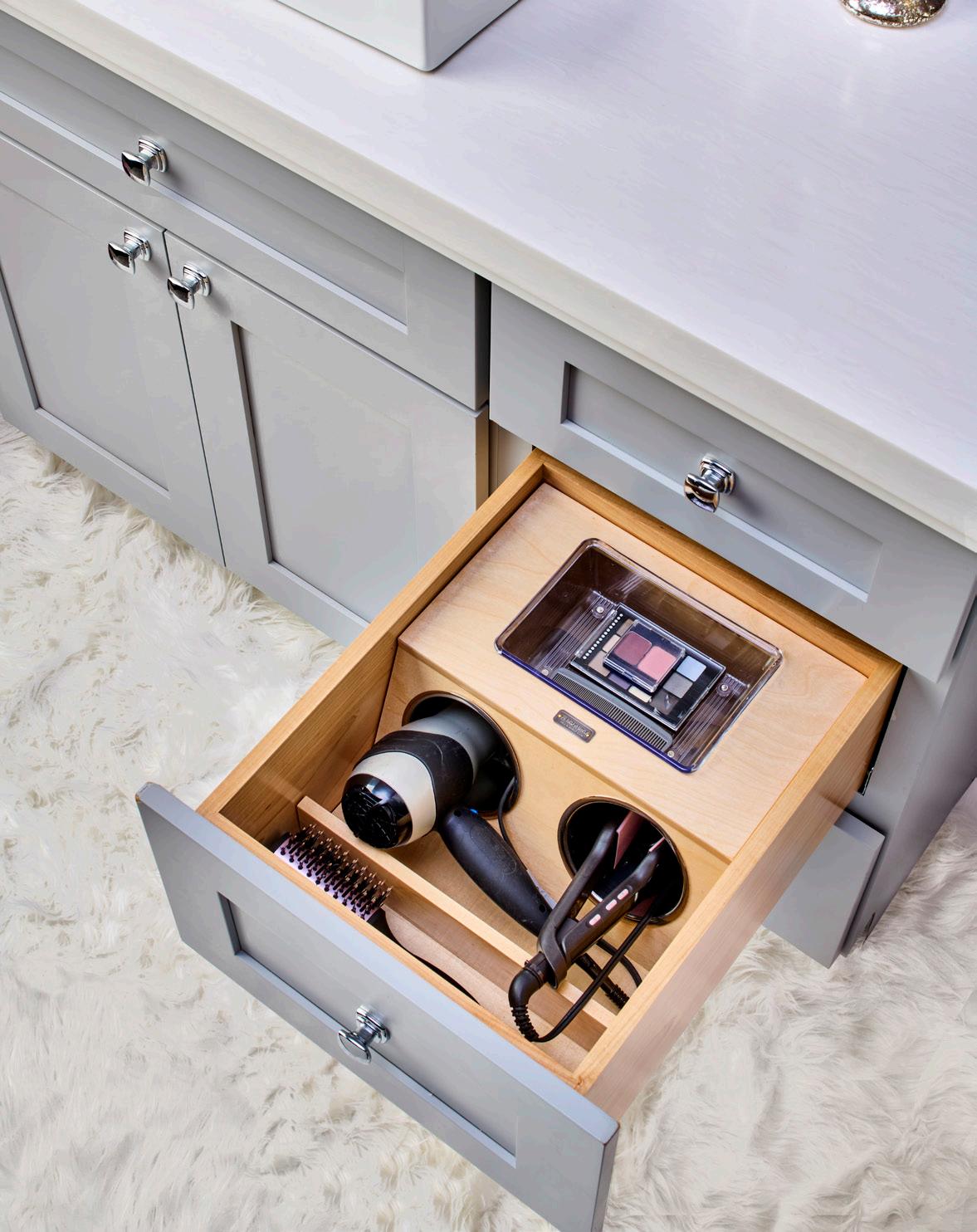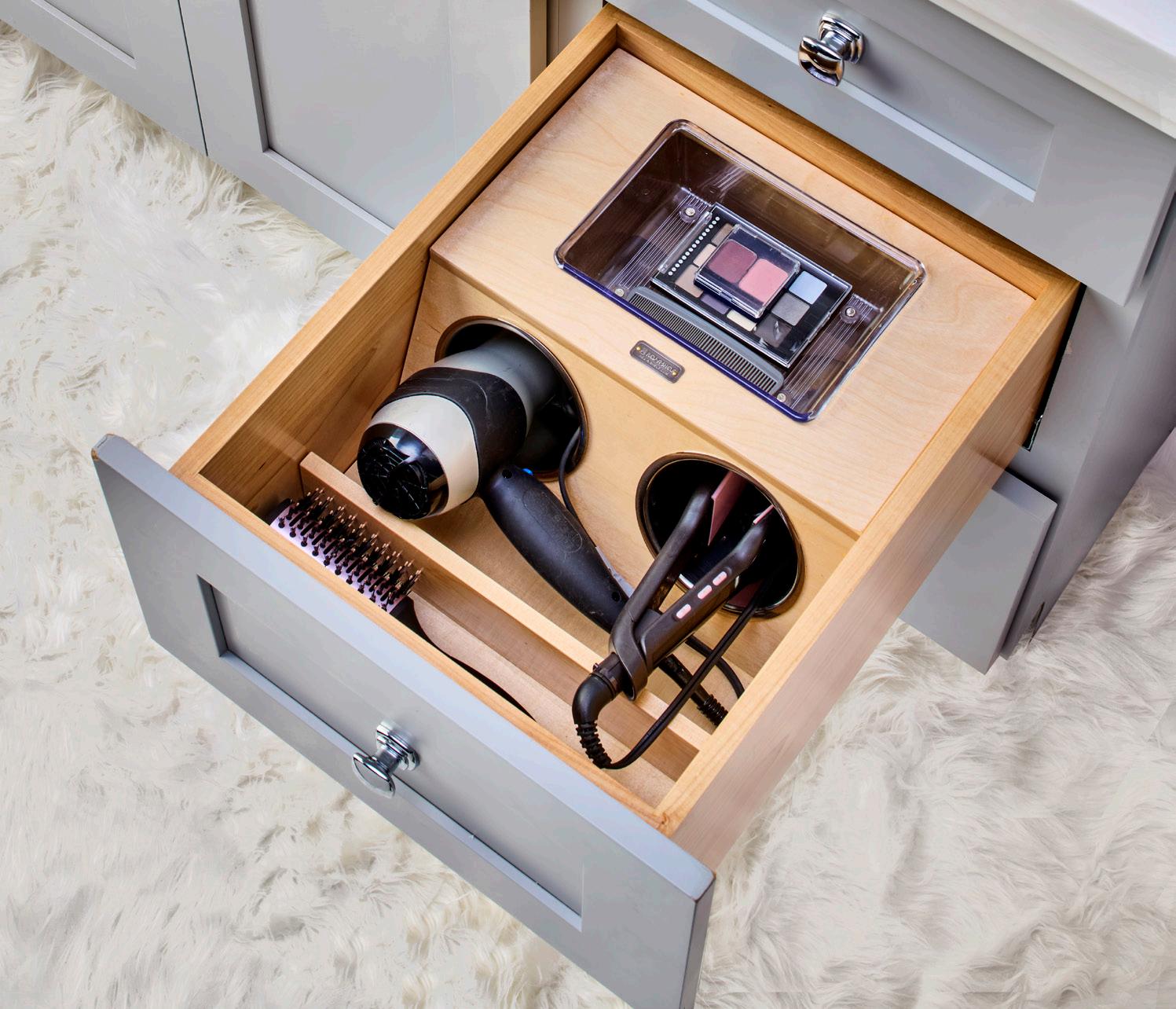 Are you tired of cluttered countertops and the hassle of searching through tangled wires in your bathroom cabinet every time you want to style your hair? Say goodbye to the chaos and hello to the 4VDI Maple Vanity Drawer Insert with Stainless-Steel Bins from Rev-A-Shelf ® ! This innovative drawer insert brings organization and efficiency to your morning routine. Equipped with stainless-steel bins and designated storage compartments for your brushes and accessories, this drawer insert keeps your styling tools neatly arranged and easily accessible. Now you can enjoy the convenience of blow drying, straightening, crimping, or curling your hair without the frustration of tangled tools!
