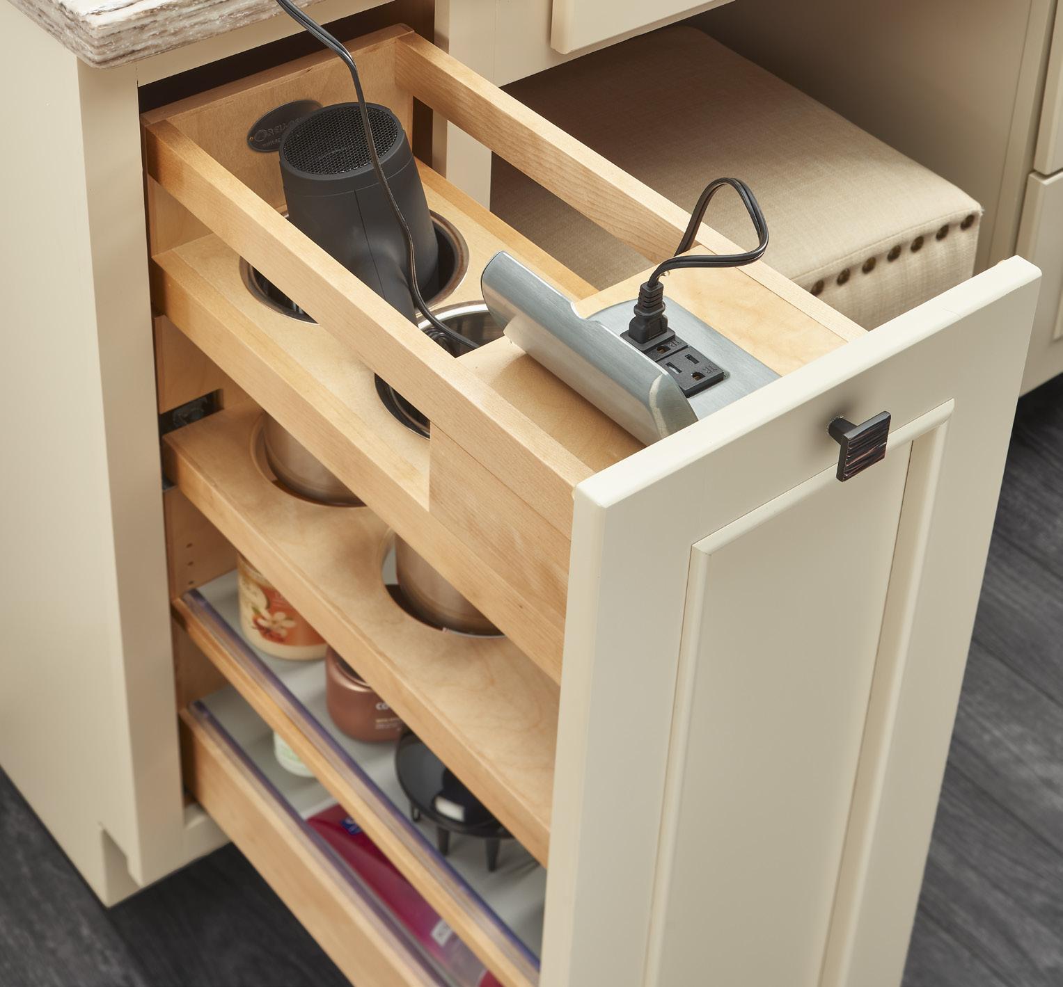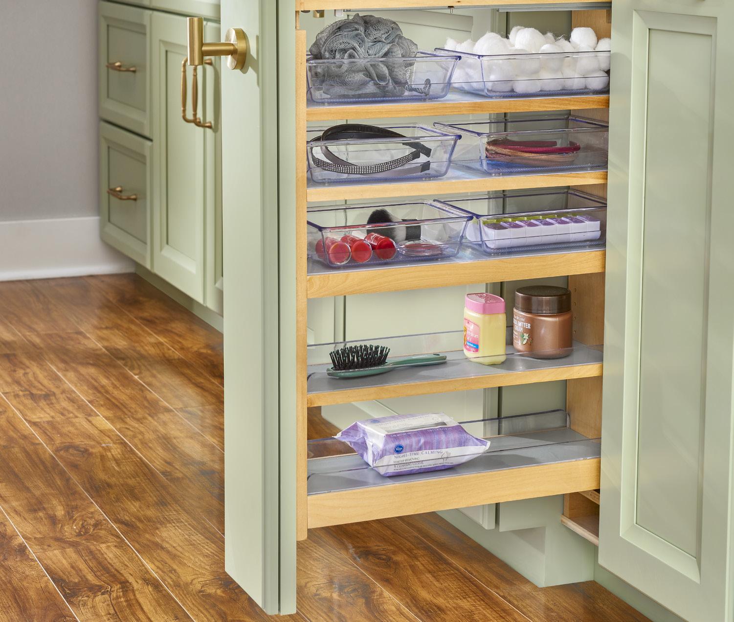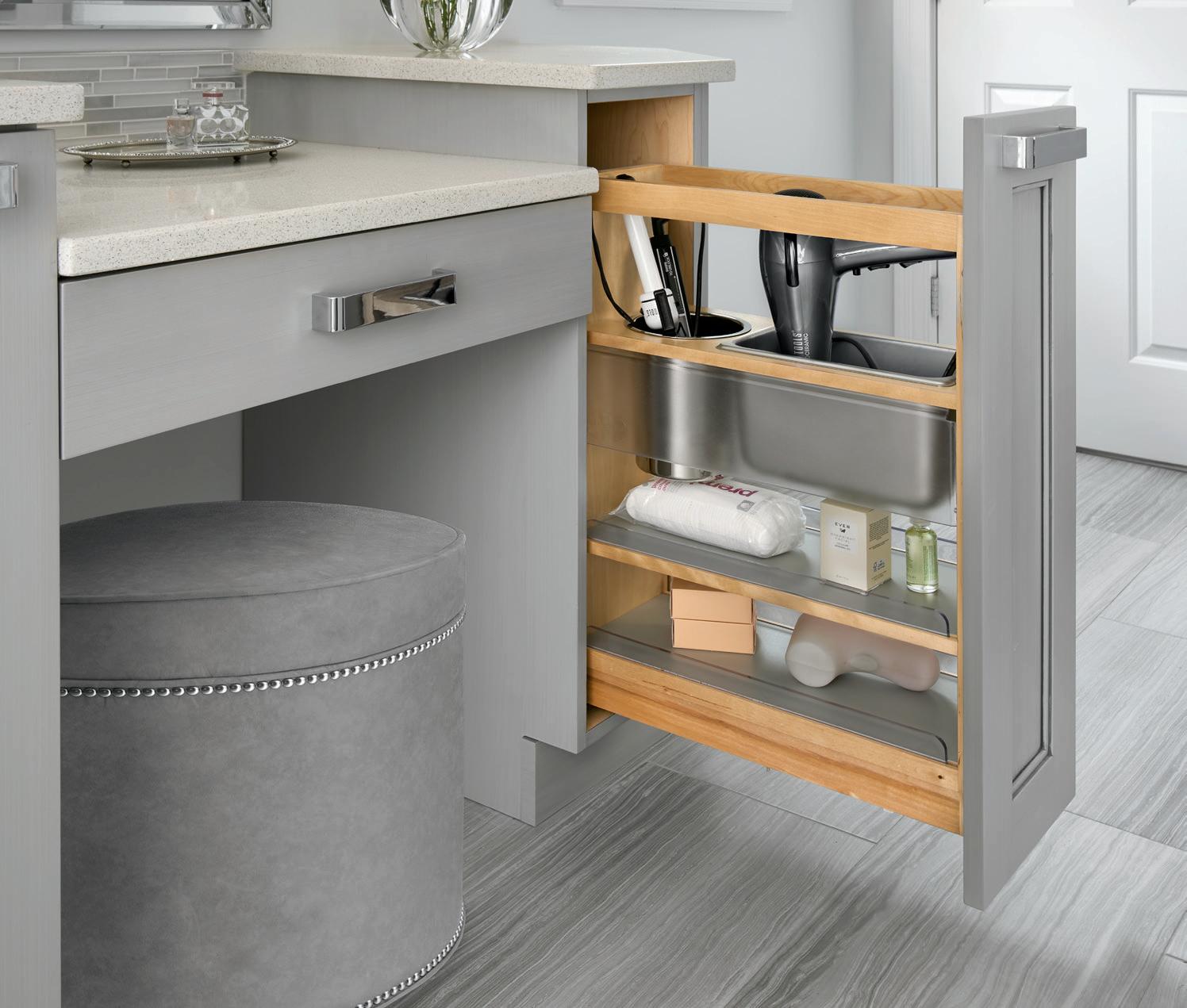 Let’s face it – the bathroom is usually one of the hardest areas to keep tidy with all those odds and ends…at least, it used to be. Now, organizing your bathroom with Rev-A-Shelf ® is easy with all the storage solutions in our vanity and bathroom accessory line. Hide your unsightly garbage with a pullout waste container, keep dirty clothes off the floor with a removable pullout hamper, expand your bathroom drawer, neatly arrange makeup and more with a cosmetic organizer and power-up your vanity with an electrical drawer or pullout. The choices are limitless. In this section, you’ll find everything you need to keep your bathroom organized.