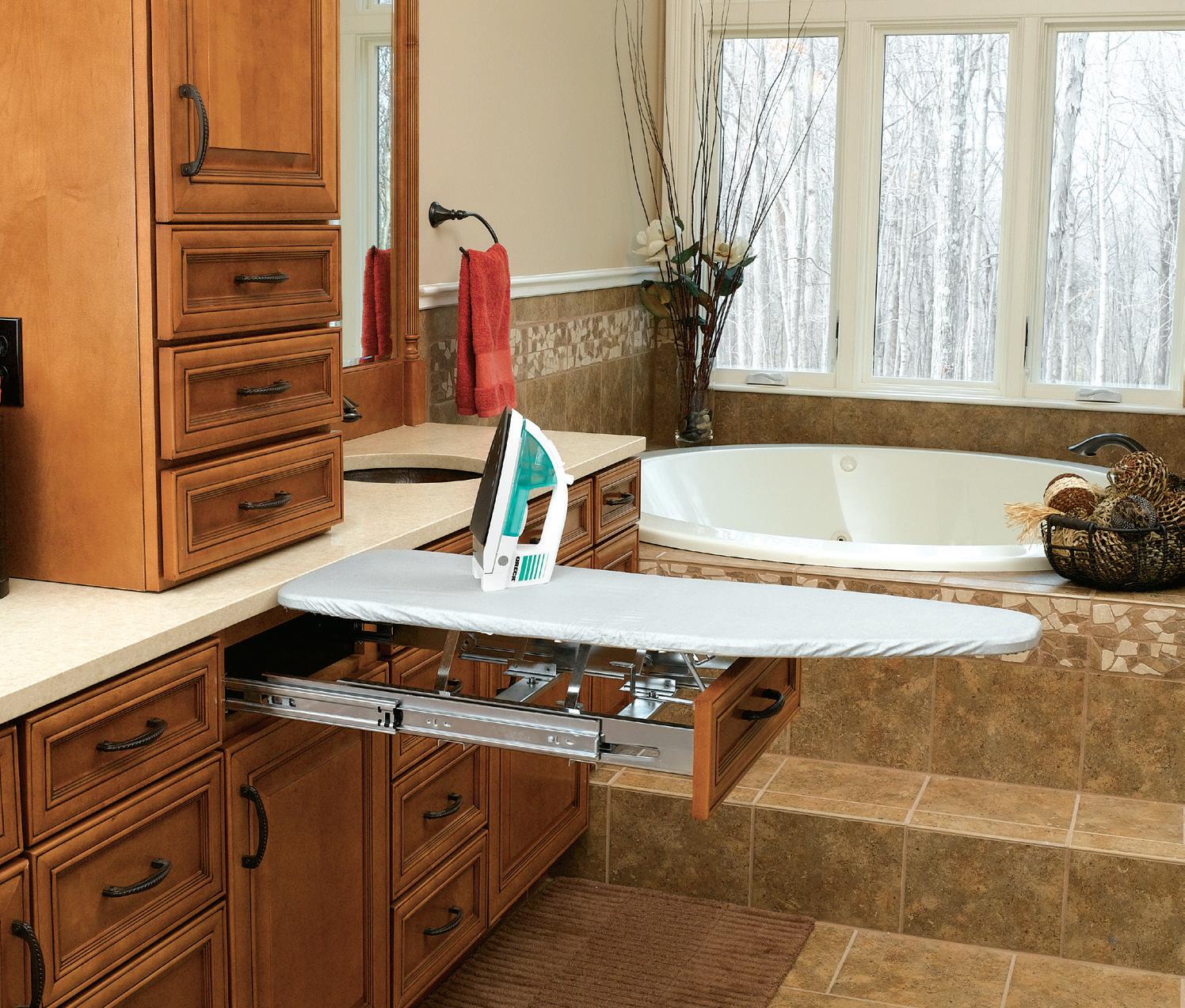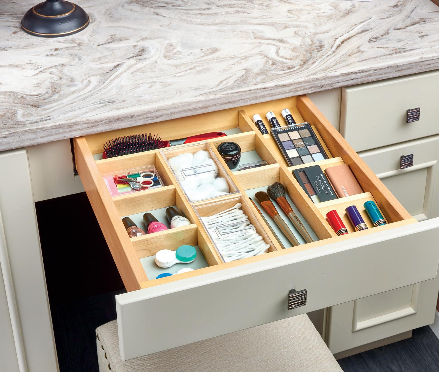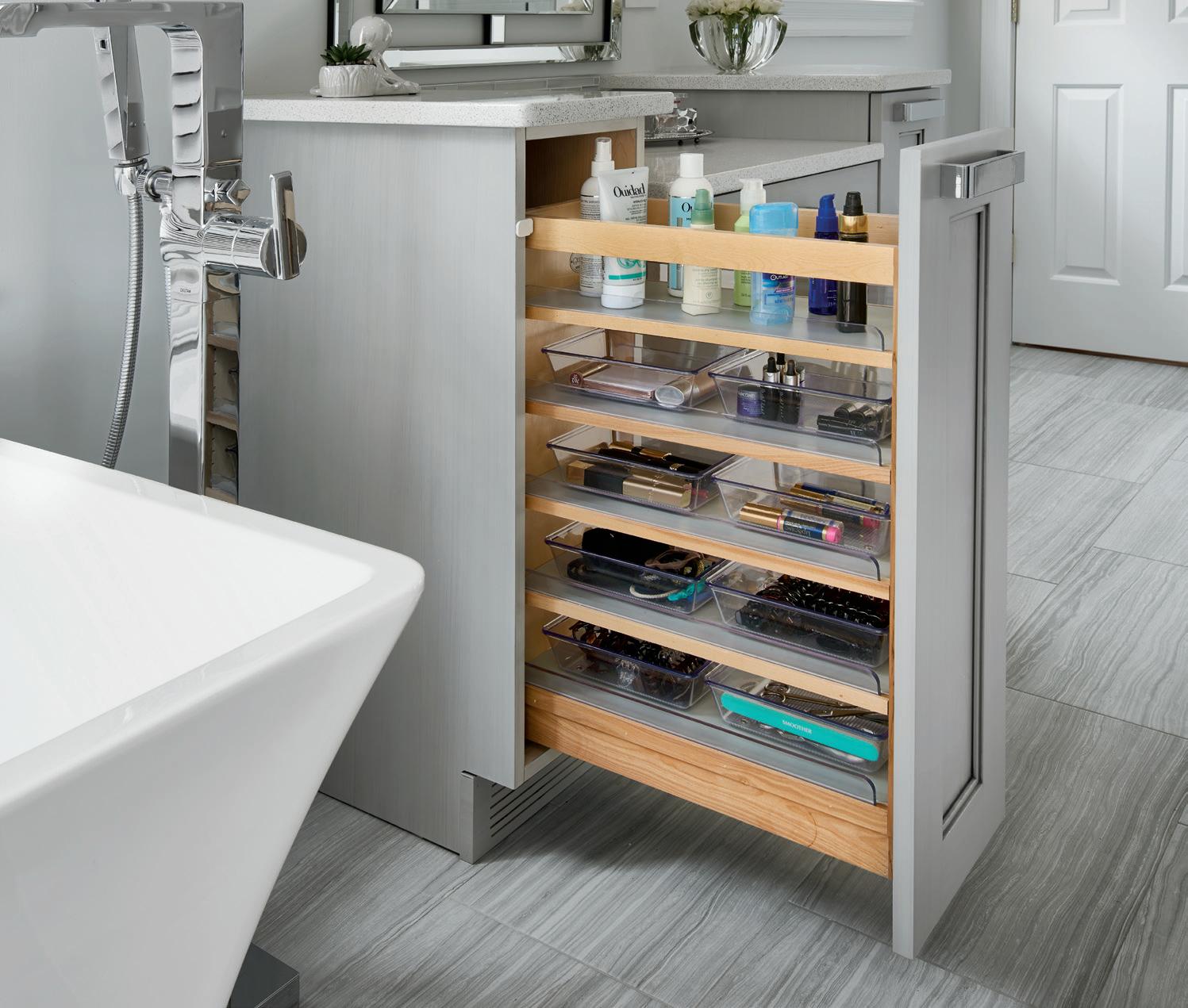 Let’s face it – the bathroom is usually one of the hardest areas to keep tidy with all those odds and ends…at least, it used to be. Now, organizing your bathroom with Rev-A-Shelf ® is easy with all the storage solutions in our vanity and bathroom accessory line. Hide your unsightly garbage with a pullout waste container, keep dirty clothes off the floor with a removable pullout hamper, expand your bathroom drawer, neatly arrange makeup and more with a cosmetic organizer and power-up your vanity with an electrical drawer or pullout. The choices are limitless. In this section, you’ll find everything you need to keep your bathroom organized.