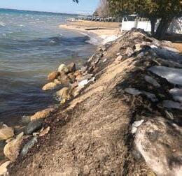 “When we really started noticing the erosion, we weren’t sure what to do,” said Sarah. “Like many homeowners on the lake, we put in a break wall. In one winter, it was decimated so we had the rocks re-stacked. Again, it fell but now the ice flows started pushing up our lawn into a massive berm. Unfortunately, without some sort of solution, we would lose mature cedar trees that once sat 30-50 ft from the water and now had exposed roots.”