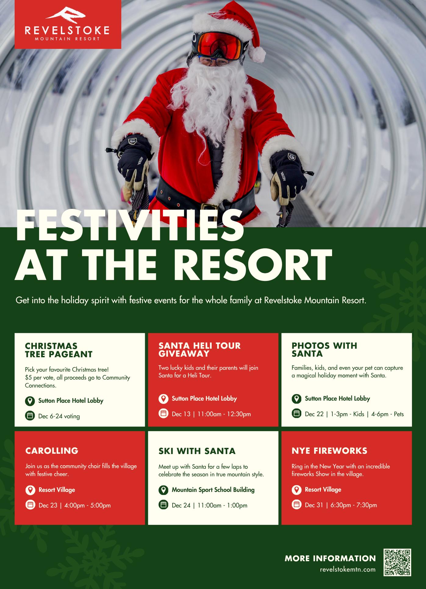 Holiday events for the end of December are on the horizon, including the Tuesday, Dec. 23 caroling in the resort village with the Revelstoke Community Choir, Wednesday, Dec. 24 Skiing with Santa and Wednesday, Dec. 31 New Year’s Eve fireworks.