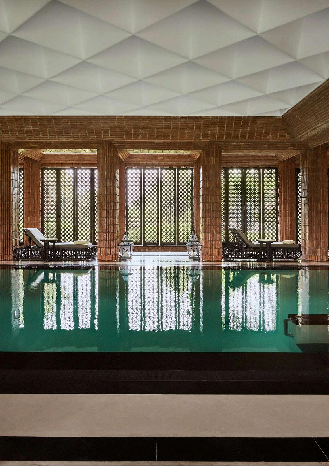 The Spa at Mandarin Oriental, Marrakech, designed by Gilles & Boissier, offers a serene retreat inspired by Andalusian cathedrals and mosques. Its warm, elegant design enhances well-being through experiences rooted in the five elements and senses. Signature treatments include the renowned Moroccan Hammam, featuring a foot ritual, rose-infused bath, body wrap, and argan oil massage. Guests can rejuvenate with special offers like the Wellness Day Pass, which includes a massage, lunch, and pool access. The spa also features a fitness center overlooking lush gardens, offering tailored training sessions and holistic exercise programs for complete renewal.
