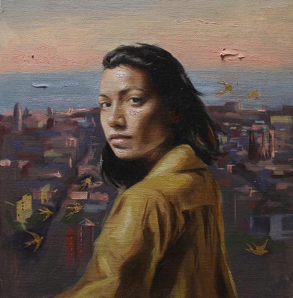 AGBAR perfilats contra un cel taronjós i l’horitzó del mar mediterrani. Un detall especial que destaca a la composició són les orenetes de color daurat que envolten la noia i la ciutat. El color daurat de les orenetes contrasta delicadament amb els colors del cel i el perfil grisós dels edificis, creant un efecte visual harmoniós i captivador.