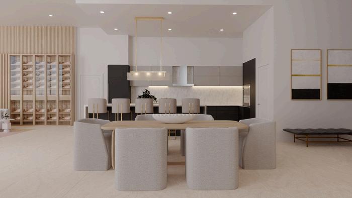 Includes: Dining Table + 6 Captain Dining Chairs + 5 Counter Stools + Pendant + Accessories + Art + Bench