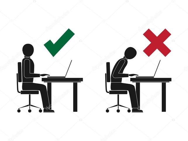 A workspace with a proper ergonomic setup can relieve your body from the aches and pains of daily office work. In general you should sit with your feet flat on the floor, with elbows around a 90 degree angle and back rest supporting the arch of your lower back Equipment that you use frequently such as your mouse and keyboard should be within arms reach The top of your computer monitor should also be adjusted so it lines up with your eyes (with your neck relatively relaxed)