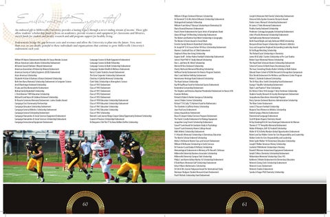 William A Dinges Endowed Veterans Scholarship Dr Dominick’53 & Mrs Helen DiNunzio Scholarship Endowment Distinguished Graduate Fellowship William H and Alma P Duncan Scholarship in Elementary Ed Diana Durand Dreamers Endowment Paul G Fisher Endowment for Guest Artist of Symphonic Band Glenn M Flegal ‘54 Wrestling Scholarship Endowment The Robert and Darlene Ford Merit Scholarship in Geography The Marion G Foster Award in Social Work Frerichs Family Women’s Basketball Scholarship Dr Joseph W ‘53 & Susan Fulton ‘84 Glass Scholarship Endowment Warren L Godshall/Class of 1866 Endowment Stephen & Mary Ann Gring Scholarship Eugene Groff - Arthur Hulme Football Scholarship Endowment James E Harf PhD ‘61 Study Abroad Scholarship Don L. and Irene M. Helsel Scholarship Mervin W Hess Endowed Scholarship Shorty Hitchcock Memorial Wrestling Scholarship Hoffman Family Endowment for Honors Program Students Alan S and Adeline Holliday Endowment Hometowne Heritage Bank Endowed Scholarship The Hazel Jackson Scholarship Ray W Kauffman Fund for Orchestral Guests Endowment Kenderdine Lectureship Endowment The Stephen and Veronica Kepchar Presidential Endowment in Honor of Dr Francine McNairy Richard G Kokat & Andrei Georgescu Scholarship James E Koken Science Scholarship Richard ‘73 & Sally ‘72 Kuhnert Fund for Mathematics The Charlotte A Lafferty History Scholarship Jean-Paul Levy Endowment Library Acquisitions Endowment Bruce R Limpert Global Services Program Endowment The Frank S Lisella Endowment for Biology Equipment Jacqueline Long French Scholarship Endowment Susan P Luek Award for Graduate Study in Psychology Susan P Luek University Honors College Award MAK Athletic Scholarship Endowment V J Marcelis Memorial Scholarship in Elementary Education The Martin Scholar Endowed Scholarship Melva S McIlwaine Master Class and Concert Endowment William B McIlwaine Scholarship in Earth Sciences Dr Francine G and Gladys B McNairy Scholarship Meteorological Endowment in Memory of Dr Russell L DeSouza Millersville University Business Associates Scholarship Millersville University Campus Club Scholarship Philip C and Karen Ashkar Murley ‘63 Scholarship Endowment B Todd Myers Memorial Golf Scholarship Endowment Edna H Myers Mathematics Scholarship Dr Erik & Mrs Jeanne Nakjavani Award for International Study Neimeyer Hodgson Student Research Grant Endowment Paul H Nichols Scholarship Fund Endowment
