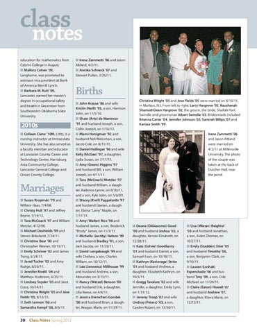 Births • John Krause ’86 and wife Kristin (Neill) ’93, a son, Harrison John, on 11/5/10. • Shain (Artz) de Manincor ’91 and husband Joseph, a son, Collin Joseph, on 1/16/12. • Marni Honigman ’92 and husband Neil Weissman, a son, Jacob Cole, on 8/11/11. • Daniel Hollinger ’96 and wife Kelly (McGee) ’97, a daughter, Lydia Susan, on 7/11/11. • Amy (Green) Higgins ’97 and husband Bill, a son, William Joseph, on 4/11/11. • Tara (McCoach) Metzler ’97 and husband William, a daughter, Kadence Lynne, on 8/30/11, and a son, Kyle John, on 5/6/09. • Stacey (Kroll) Pappalardo ’97 and husband Gaetan, a daughter, Elaina “Lainy” Maple, on 7/17/11. • Amy (Walter) Rice ’98 and husband James, a son, Broderick “Brody” James, on 11/3/11. • Michelle (Jacoby) Nelson ’99 and husband Bradley ’01, a son, Jack Jacoby, on 11/23/11. • David Longabaugh ’99 and wife Chelsea, a son, Charles William, on 10/12/11. • Lea (Janowicz) Millhouse ’99 and husband Andrew, a son, Alexander, on 3/15/11. • Nancy (Wetzel) Benson ’00 and husband Erik, a daughter, Lilia Reese, on 4/4/11. • Jessica (Hemcher) Gondek ’00 and husband Brian, a daughter, Reagan Marie, on 11/29/11.