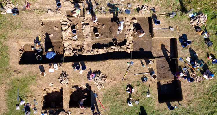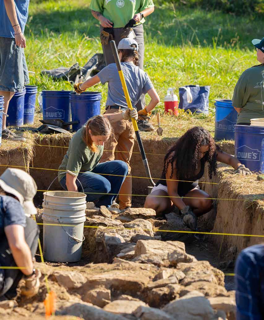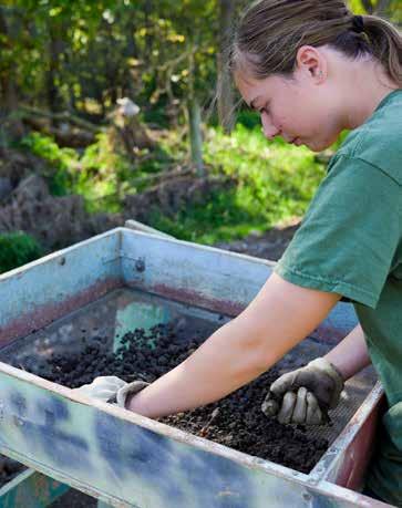On a warm day in October during a site visit, archaeology and anthropology major Jillian Baumberger ’26, a selfdescribed bone enthusiast, talks about how these types of remains offer clues about the past. She points to a portion of a jawbone she found in the pit. “It’s really cool to see what kind of animals were there at the tavern, and it’s interesting to see what was popular to eat at that time.”