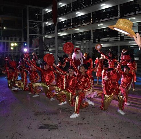 El espectáculo continuó con la presentación de otros números artísticos como: el baile “Remix Navi-hop”, de Axel Fuentes, alumno de la Licenciatura en Diseño Gráfico; seguido de la interpretación vocal del alumno Leonel Castillo, quién además, estuvo acompañado por sus compañeros de la Licenciatura de Derecho; el show siguió con un villancico coreográfico, ejecutado por alumnas y alumnos del primer semestre grupo A de la Licenciatura en Ciencias de la Comunicación, para posteriormente concluir con el performance de lipsync “Santa Claus llegó a la ciudad” de Luis