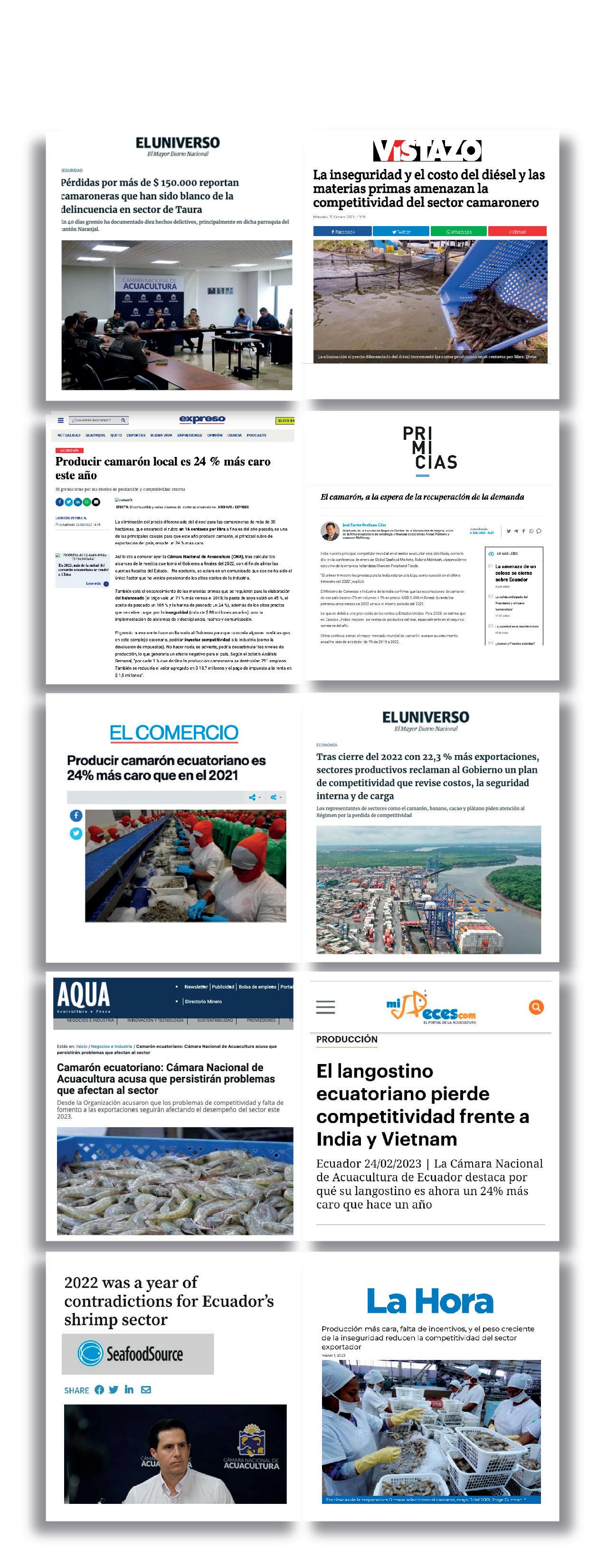 En síntesis, el sector ha hecho importantes inversiones y ha visto su estructura de costo abultarse, mientras el precio internacional del camarón y la pérdida de competitividad, agravada por factores exógenos como la inseguridad, los empuja constantemente por debajo de su punto de equilibrio e inclusive a preocupantes pérdidas durante algunos meses del año, incluso siendo este el caso de productores con eficiencias promedio, por lo que la situación de unidades productivas ineficientes es dramática.