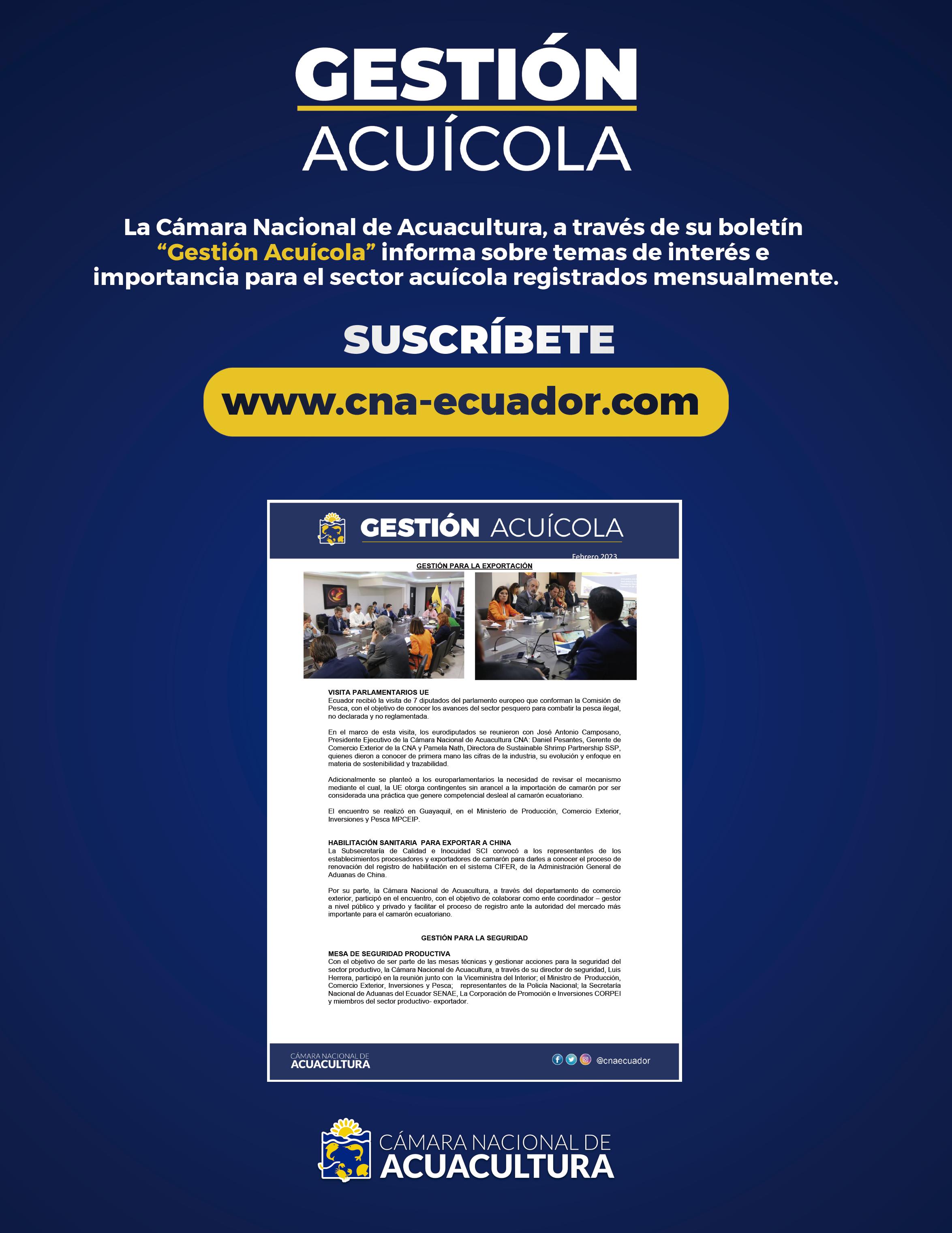 Por su parte, la Cámara Nacional de Acuacultura, a través de su gerente de Comercio Exterior, Daniel Pesantes, participó en el encuentro, con el objetivo estar bien informado y colaborar como ente coordinador-gestor a nivel público y privado.