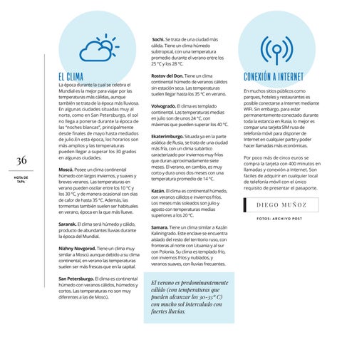 La época durante la cual se celebra el Mundial es la mejor para viajar por las temperaturas más cálidas, aunque también se trata de la época más lluviosa. En algunas ciudades situadas muy al norte, como en San Petersburgo, el sol no llega a ponerse durante la época de las “noches blancas”, principalmente desde finales de mayo hasta mediados de julio.En esta época, los horarios son más amplios y las temperaturas pueden llegar a superar los 30 grados en algunas ciudades. Moscú. Posee un clima continental húmedo con largos inviernos, y suaves y breves veranos. Las temperaturas en verano pueden oscilar entre los 10 °C y los 30 °C, y de manera ocasional con olas de calor de hasta 35 °C. Además, las tormentas también suelen ser habituales en verano, época en la que más llueve. Saransk. El clima será húmedo y cálido, producto de abundantes lluvias durante la época del Mundial. Nizhny Novgorod. Tiene un clima muy similar a Moscú aunque debido a su clima continental, en verano las temperaturas suelen ser más frescas que en la capital. San Petersburgo. El clima es continental húmedo con veranos cálidos, húmedos y cortos. Las temperaturas no son muy diferentes a las de Moscú.
