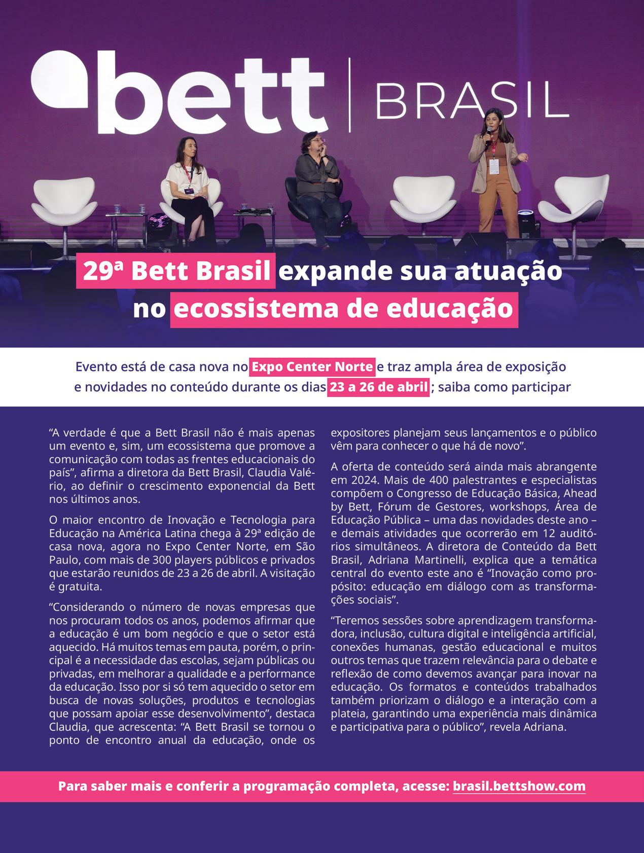 Educação é uma publicação mensal da RFM Editores destinada a mantenedores, educadores e interessados em educação. Esta publicação não se responsabiliza por ideias e conceitos emitidos em artigos ou matérias assinadas, que expressam apenas o pensamento dos autores, não representando necessariamente a opinião da revista. A publicação se reserva o direito, por motivo de espaço e clareza, de resumir artigos.