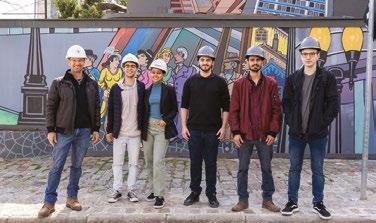 O professor e engenheiro civil Carlos Gustavo Nastari Marcondes com os alunos do curso de Engenharia Civil da PUCPR em frente ao pai nel pintado pela Construto ra Hugo Peretti com obra de Juarez Machado. A ação no muro do bairro Alto da Gló ria faz parte do projeto Gen tileza Urbana. Foto: Wagner Abreu