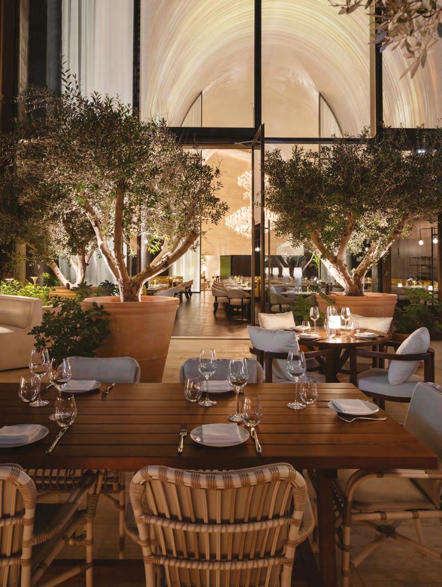 O paisagismo projetado por Madison Cox cria espaços íntimos com jardins nas áreas externas, onde oliveiras se integram ao ambiente