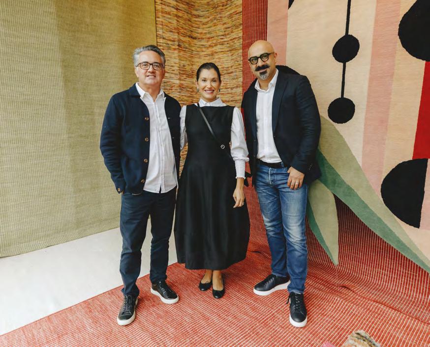 Sérgio Valliatti e Luciana Patrão apresentam a coleção Telas, para a nova vitrine da Botteh, no Batel, criando uma ambientação que destaca a grandiosidade dos tapetes handmade de Naia Ceschin. Na imagem, Sérgio e Luciana com Amir Shahrouzi, proprietário da Botteh Handmade Rugs. Foto: Patrícia Amancio