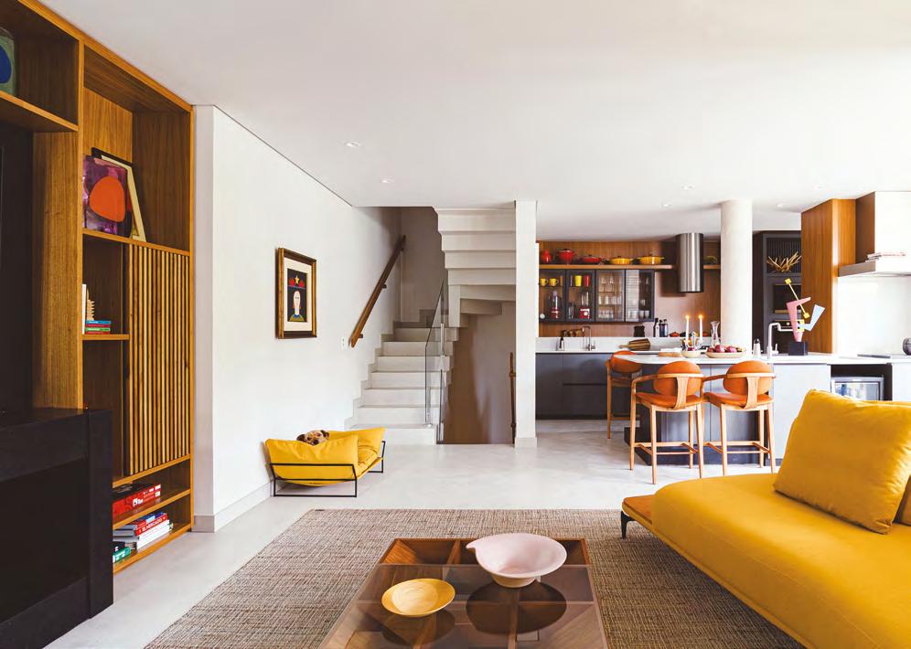 Primeiro escolheu um sofá amarelo, protagonista do espaço, de Daniela Ferro, que trouxe modernidade. A mesa de jantar da loja é evidenciada com o pendente Amorfa, uma peça icônica de Arthur Casas. A bancada em madeira bruta, logo ao lado, serve de apoio à churrasqueira, mas pode ser usada também como buffet ou mesa de trabalho. As confortáveis banquetas Omar, de Rejane Carvalho Leite, e as cadeiras Douro de Henrique Schreiber, foram escolhidas a dedo com, também, a charmosa caminha Pet da Oslo estúdio para o aconchego de Lua, sua cachorrinha.