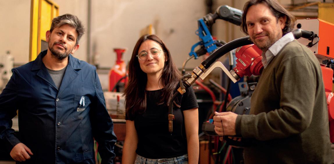 Arriba: Brazo robótico para soldadura/manufactura aditiva de materiales metálicos Abajo: Parte del equipo de trabajo: Fabián Stilo (izq.), Mercedes Duran (centro), Hernán Svoboda (der.)