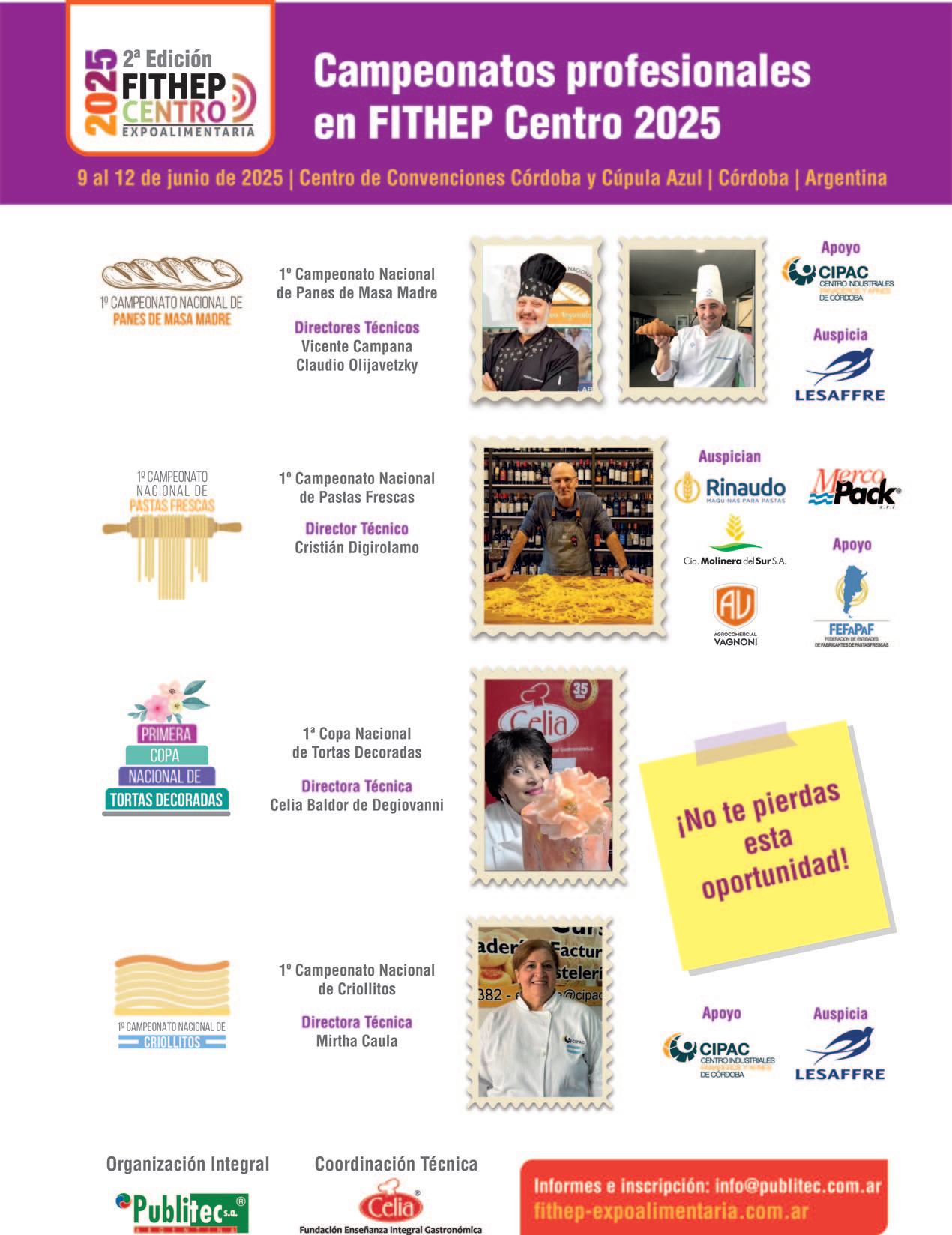 Los campeonatos de panes de masa madre, del criollito, de decoración de tortas y de la pasta se realizarán por primera vez en Córdoba y responden a un mismo objetivo: poner el foco en productos que tienen un amplio camino por recorrer en todo el territorio nacional y que merecen ser valorizados por los profesionales del mundo dulce. Los interesados en inscribirse deben tomar contacto a través de info@publitec.com.ar.