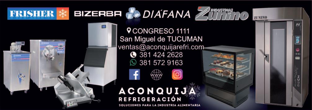cartables. Instrumental de laboratorio. Bandas transportadoras, cintas metálicas. Impresoras y sistemas de impresión y codificación. Software de gestión para establecimientos gastronómicos. Merchandising y uniformes. Máquinas para chocolatería y heladería. Fabricadoras de hielo. Equipos de refrigeración.