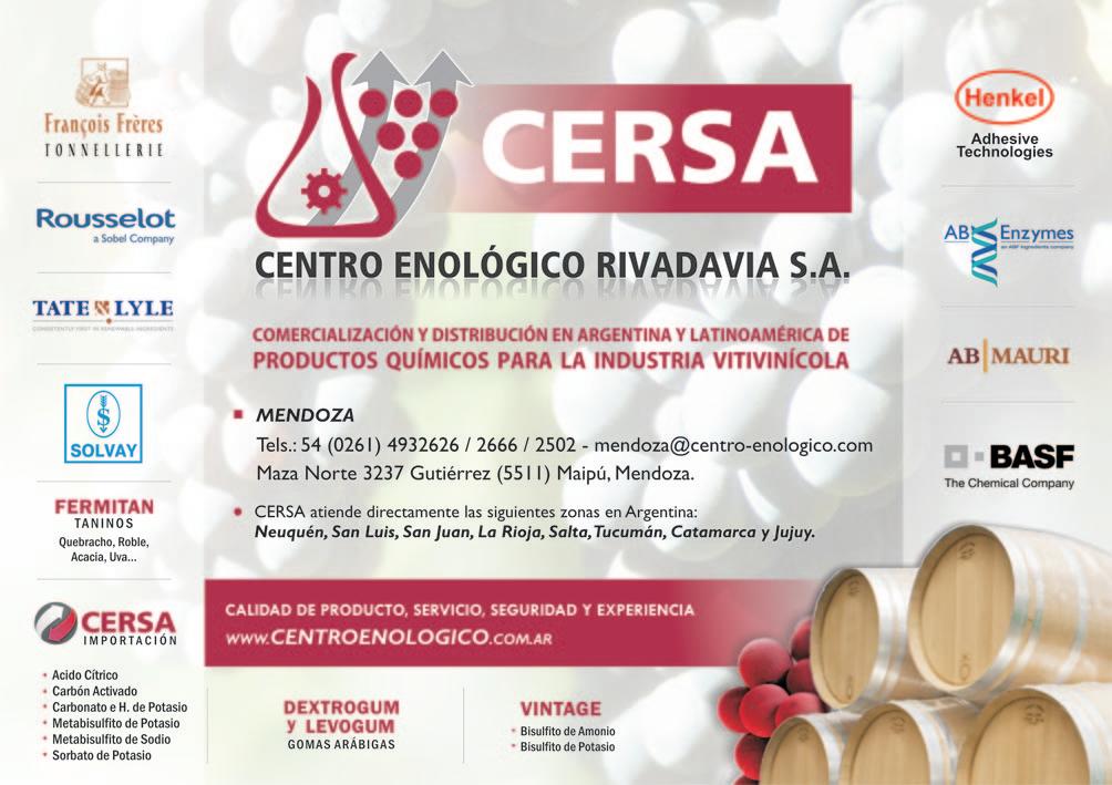 Gutiérrez, Maipú – Mendoza – Arg. Tel: (54 261) 493-2626/2666/ 2502 mendoza@centro-enologico.com www.centroenologico.com.ar Comercialización y distribución en Argentina Latinoamérica de productos químicos para la indus tria vitivinícola, de conservas, jugueras, de los cítricos y tabacale ras.