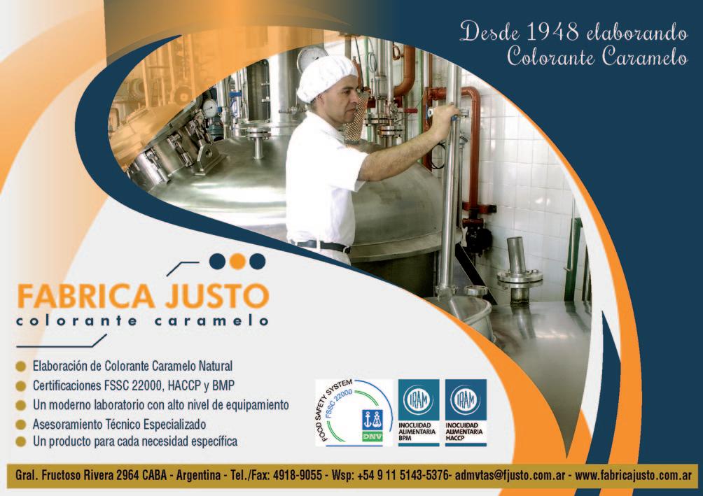Fructuoso Rivera 2964 1437GRT) Villa Soldati. Bs. As. - Argentina Tel.: (54 11) 4918-9055/4918-3848 Fax: (54 11) 4918-9055 WApp: (+54 911) 5143-5376 admvtas@fjusto.com.ar www.fabricajusto.com.ar Elaboración de Colorantes Caramelo para distintos usos, abasteciendo el mercado de gaseosas, licores, amargos, cerve zas, aditivos alimenticios, alimen tos para mascotas, panadería, pas telería, café soluble, salsas, cara melos, vinagre, etc., estando en condiciones de desarrollar y pro ducir a pedido del cliente el Colorante Caramelo que requiera. Más de 70 años en la industria alimentaria lo avalan.