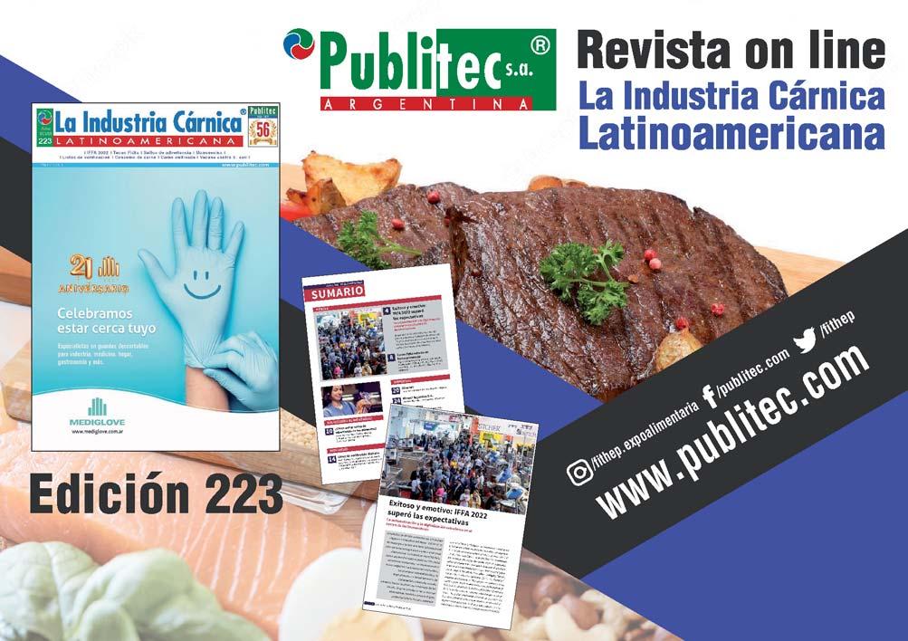 ❚ Tecno Fidta ❚ Neutralidad carbono ❚ Una salud ❚ Cadena aviar ❚ ❚ XXI JAP ❚ Calidad de carne ❚ Pesca y acuicultura ❚ Año XLVIII www.publitec.comISSN 0325-3414 LA INDUSTRIA CARNICA LATINOAMERICANA N 224 224